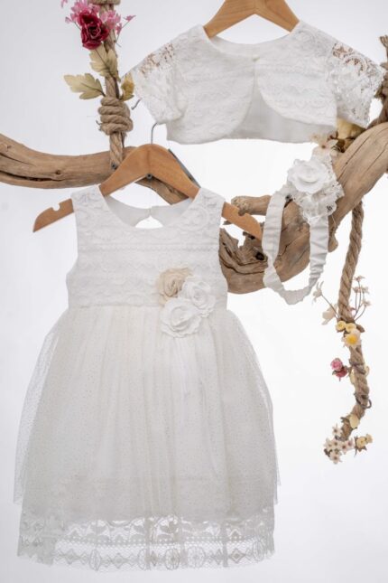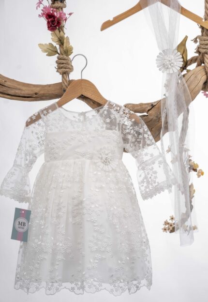 Η Αθωότητα Ανθίζει: Βαπτιστικό Φόρεμα με Δαντέλα και Λουλούδι ΜΒ Κ125