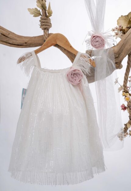 Η Αθωότητα Ανθίζει: Βαπτιστικό Φόρεμα με Δαντέλα, Πούπουλα και Ροζ Λουλούδι ΜΒ Κ88Ε
