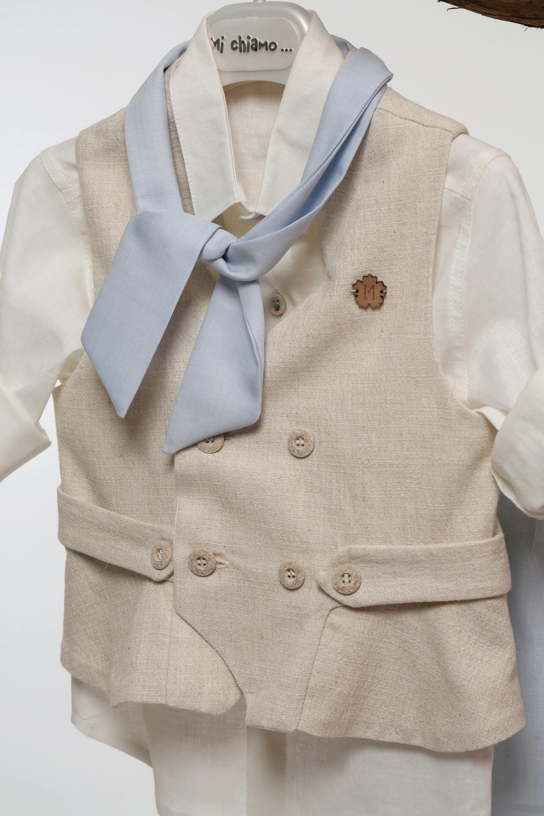 Ένα κομψό και άνετο βαπτιστικό σύνολο για αγόρι, ιδανικό για μια ξεχωριστή ημέρα. Αποτελείται από ένα γιλέκο σε μπεζ απόχρωση με διακριτική υφή, ένα λευκό πουκάμισο, ένα γαλάζιο παπιγιόν και ένα γαλάζιο παντελόνι.