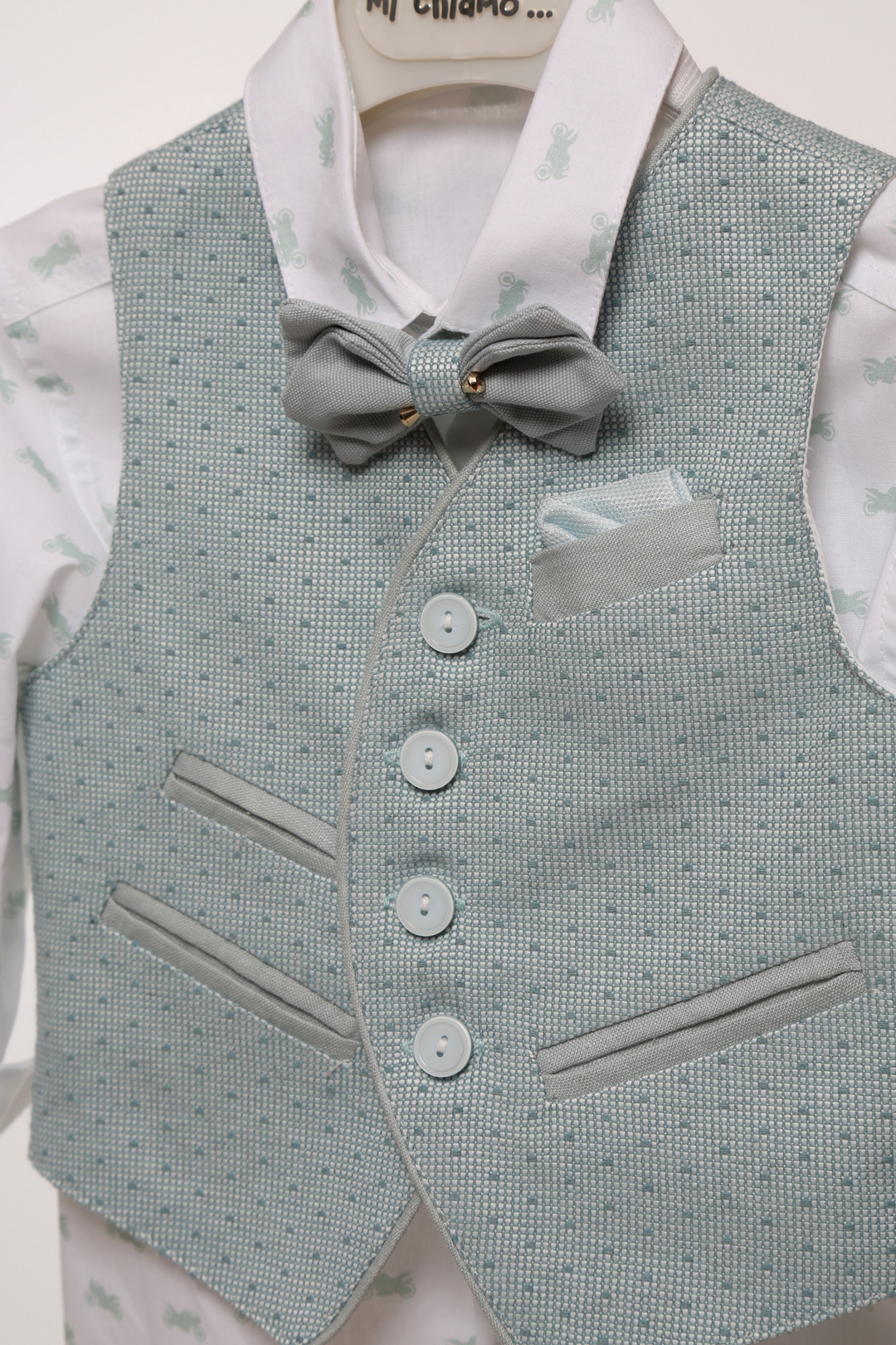 Ένα κομψό βαπτιστικό σύνολο για αγόρι, που περιλαμβάνει λευκό πουκάμισο, γκριζοπράσινο γιλέκο, γκρι παπιγιόν και γκριζοπράσινο παντελόνι. Ιδανικό για μια ιδιαίτερη περίσταση.
