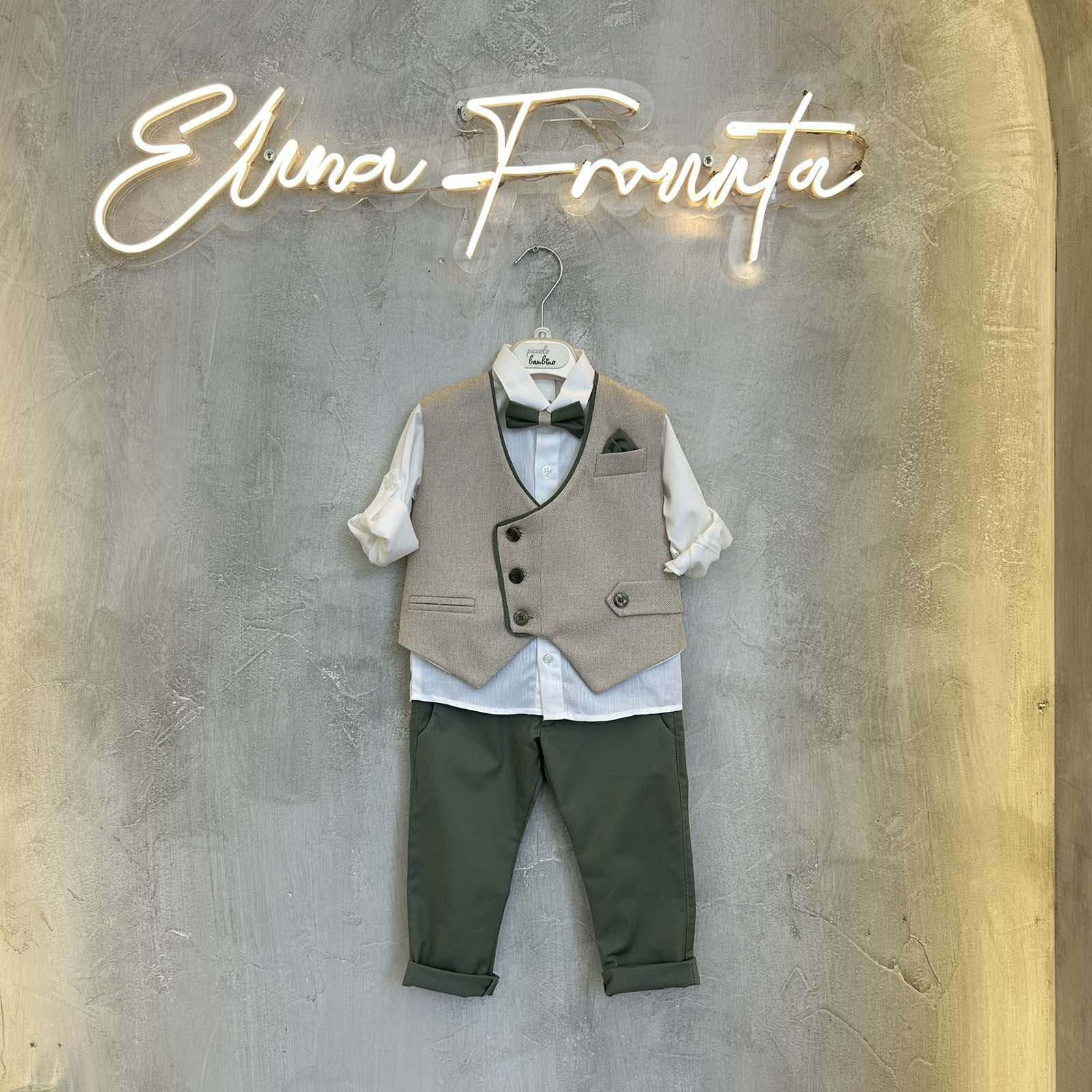 Το σετ περιλαμβάνει ένα εκλεπτυσμένο σύνολο ρούχων, το οποίο ενώνει το κλασικό με το μοντέρνο. Το χακί παντελόνι συνδυάζεται αρμονικά με το λευκό πουκάμισο και το λινό γιλέκο σε μπεζ απόχρωση, ενώ το παπιγιόν και το ταιριαστό μαντηλάκι στην τσέπη προσθέτουν ιδιαίτερο χαρακτήρα και στυλ.