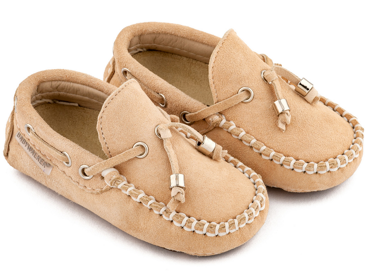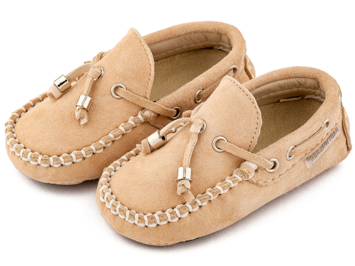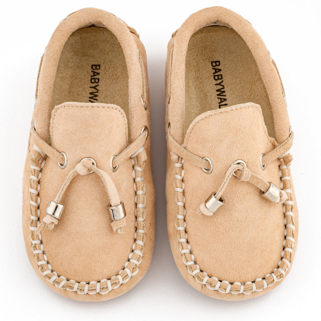 Ένα ζευγάρι κομψά παιδικά μοκασίνια σε μπεζ απόχρωση, κατασκευασμένα από μαλακό σουέτ δέρμα, με διακοσμητικά κορδόνια και μεταλλικές λεπτομέρειες.