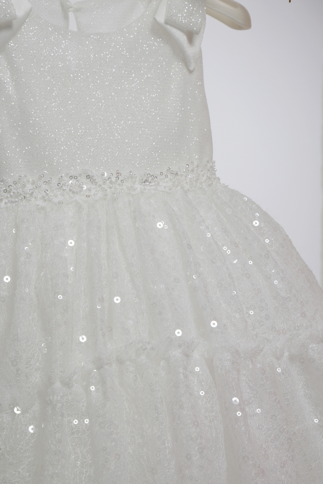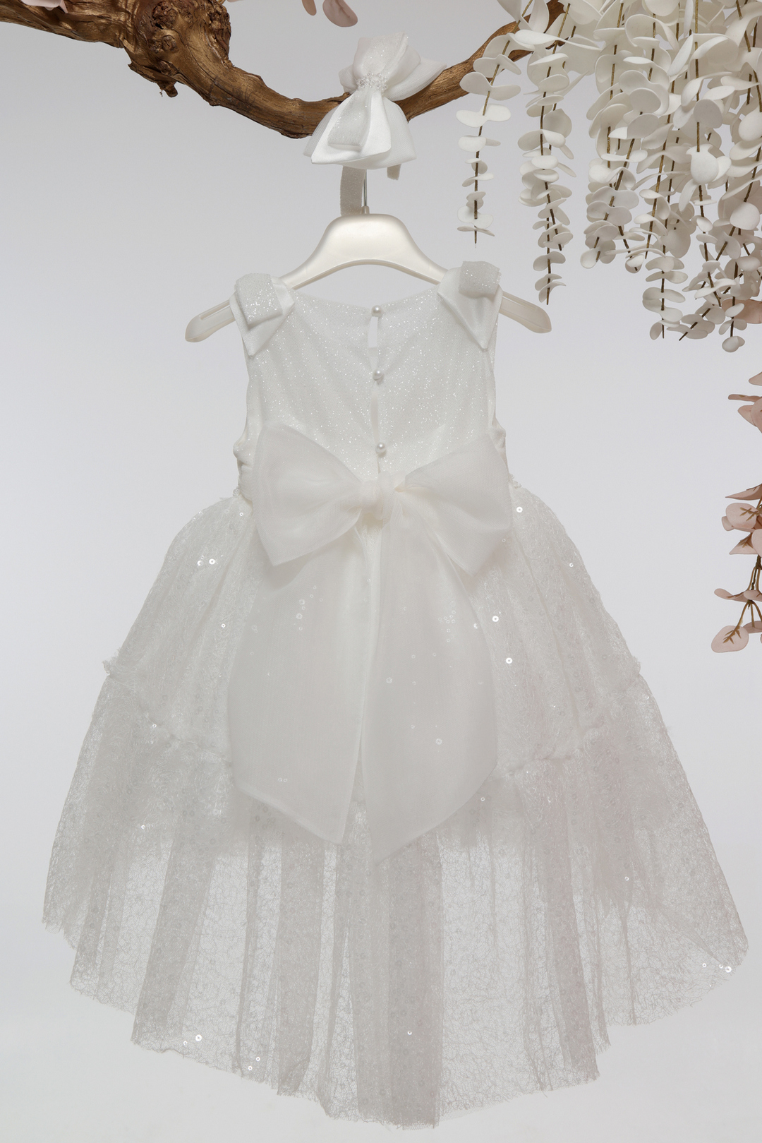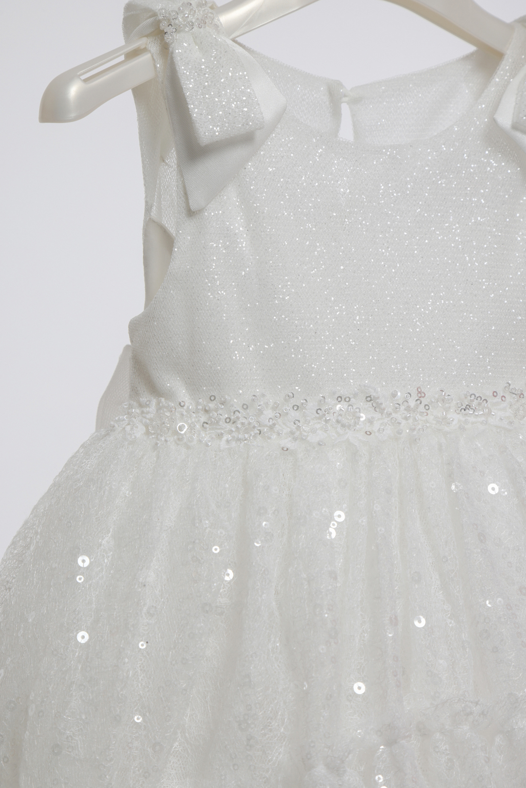 Ιβουάρ βαπτιστικό φόρεμα με glitter μπούστο, διακοσμητικούς φιόγκους στις τιράντες και φούστα από glitter τούλι και δαντέλα. Διακριτικές παγιέτες για λάμψη και ασορτί κορδέλα μαλλιών. Ιδανικό για μια πριγκιπική εμφάνιση!