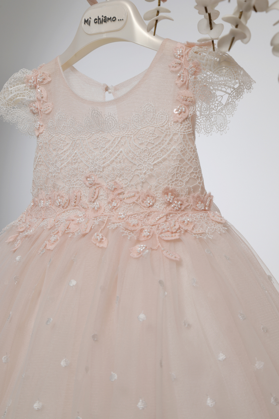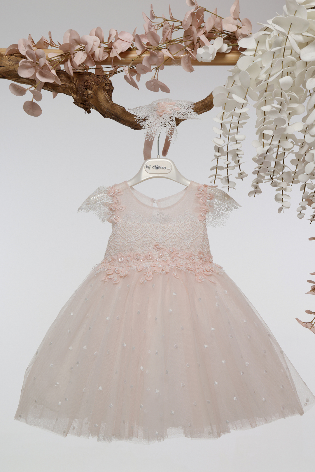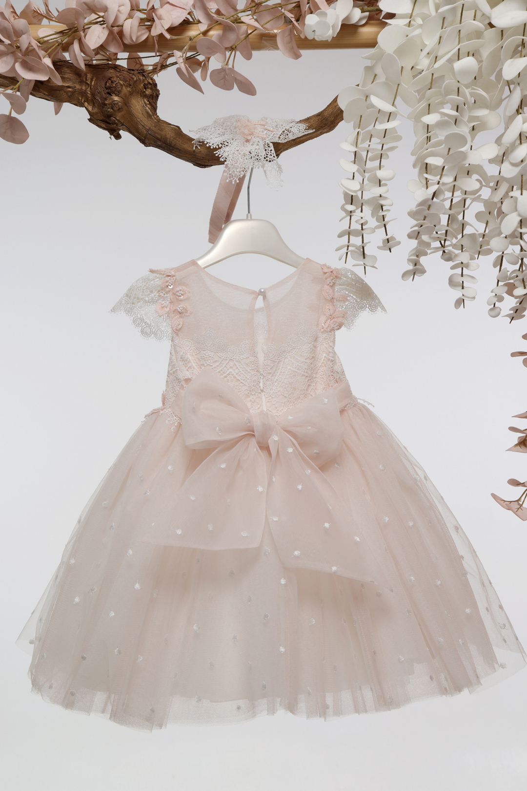 Απόχρωση πούδρας βαπτιστικό φόρεμα με δαντελένιο μπούστο, τούλινη φούστα με πουά λεπτομέρειες και διακριτικά λουλουδάτα απλικέ. Συνοδεύεται από ασορτί κορδέλα μαλλιών. Ρομαντική και κομψή επιλογή για μια ξεχωριστή εμφάνιση!
