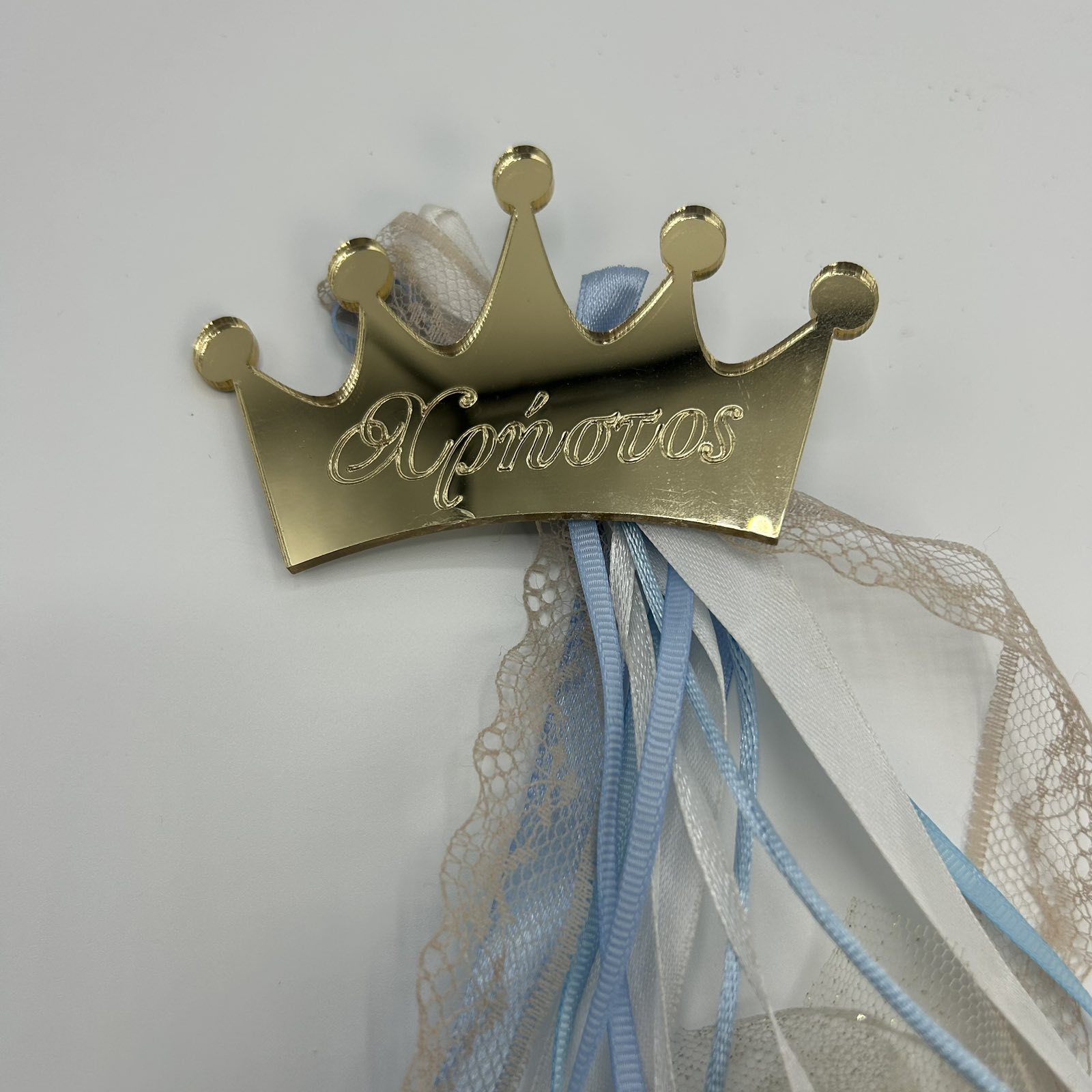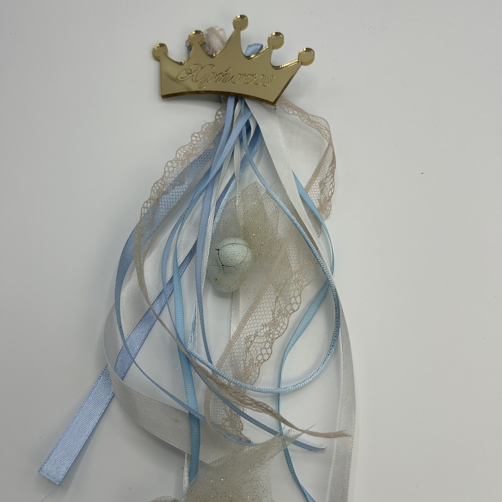 Αυτή η μοναδική μπομπονιέρα βάπτισης είναι εμπνευσμένη από τον μικρό πρίγκιπα της οικογένειας! Στο επίκεντρο της διακόσμησης βρίσκεται μια πολυτελής μεταλλική κορώνα σε χρυσή απόχρωση, με το όνομα του παιδιού χαραγμένο με κομψά γράμματα. Οι απαλές κορδέλες σε αποχρώσεις του γαλάζιου, της άμμου και του λευκού δίνουν μια ανάλαφρη και αέρινη αίσθηση, ενώ το τούλι με τις διακριτικές χρυσές λεπτομέρειες προσθέτει λάμψη και φινέτσα. Ιδανική επιλογή για μια βάπτιση γεμάτη ρομαντισμό και αρχοντιά!