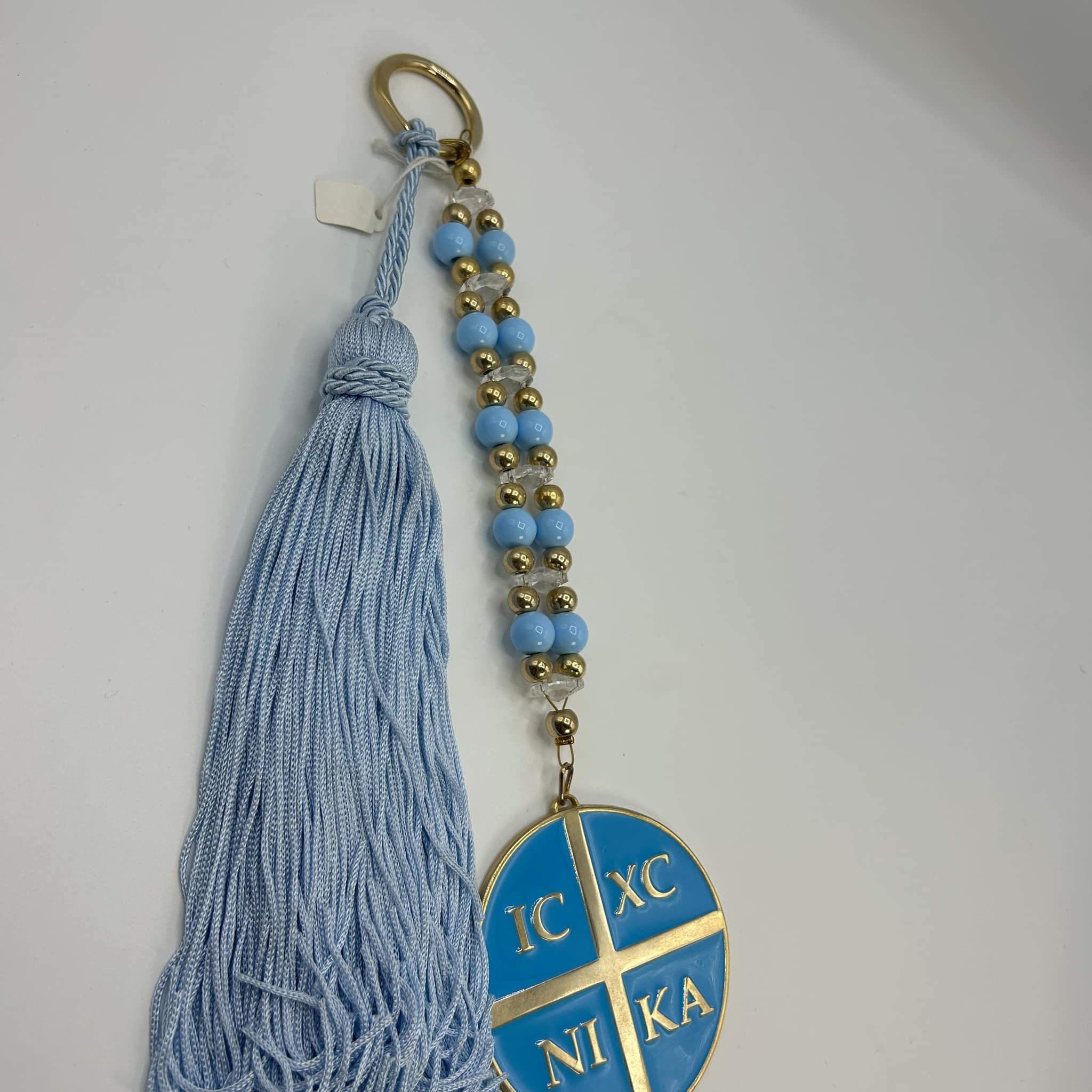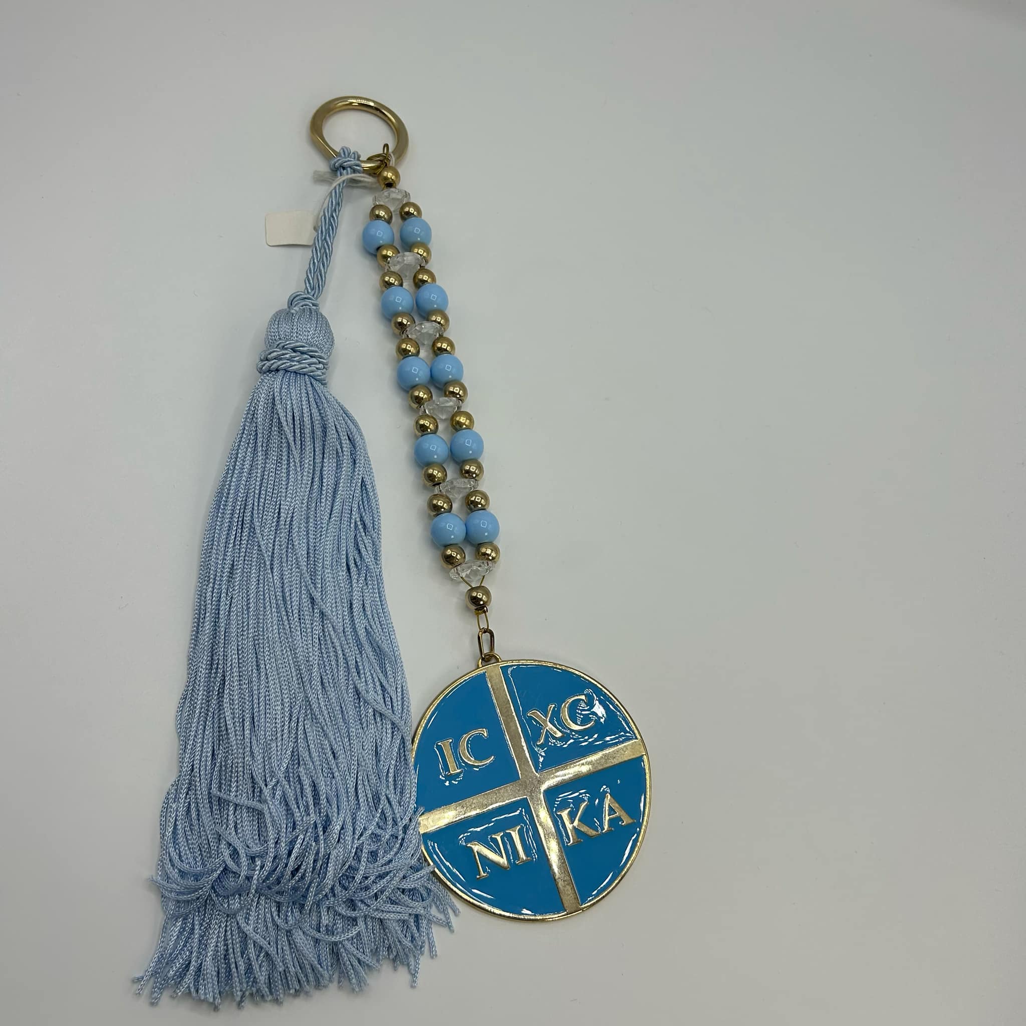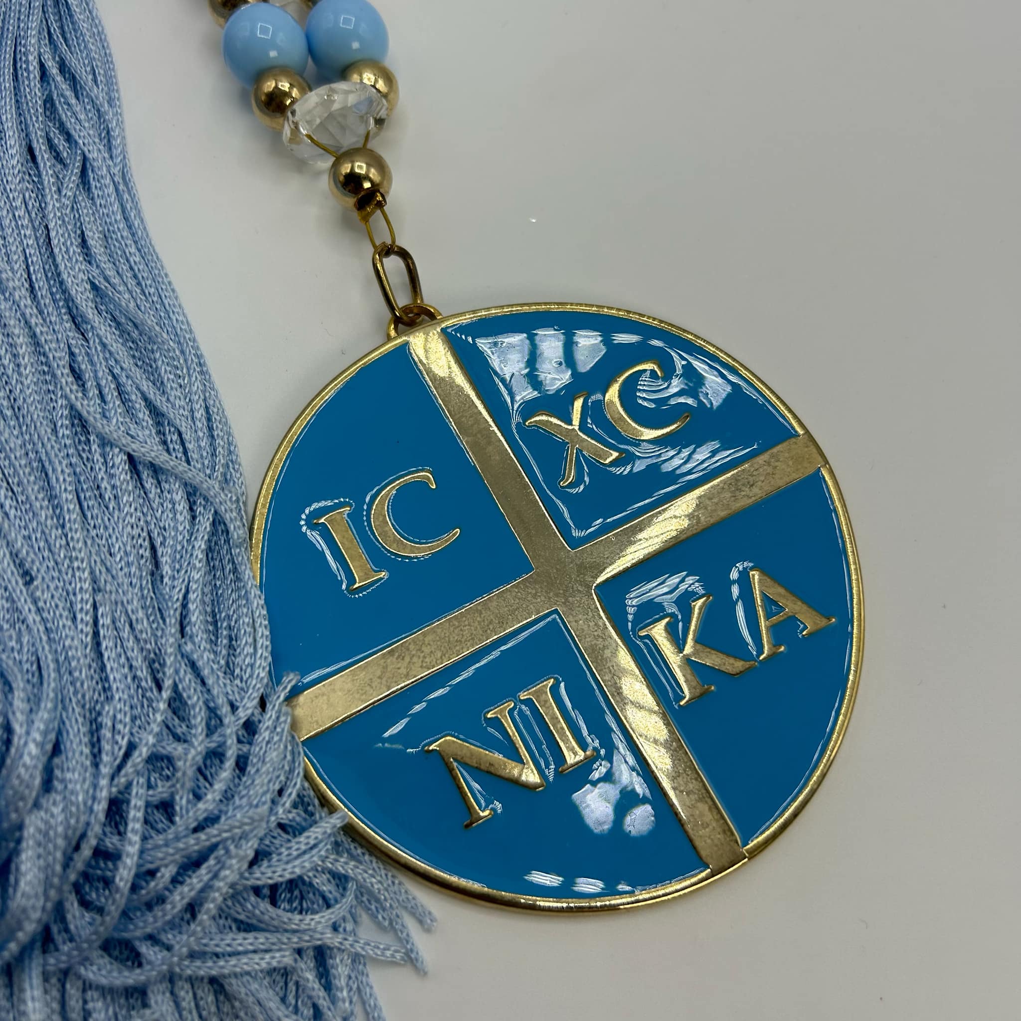 Γούρι γεννητούρι με χρυσές και γαλάζιες λεπτομέρειες, διακοσμημένο με φούντα και μεταλλικό στοιχείο IC XC NIKA, σύμβολο ευλογίας και προστασίας.