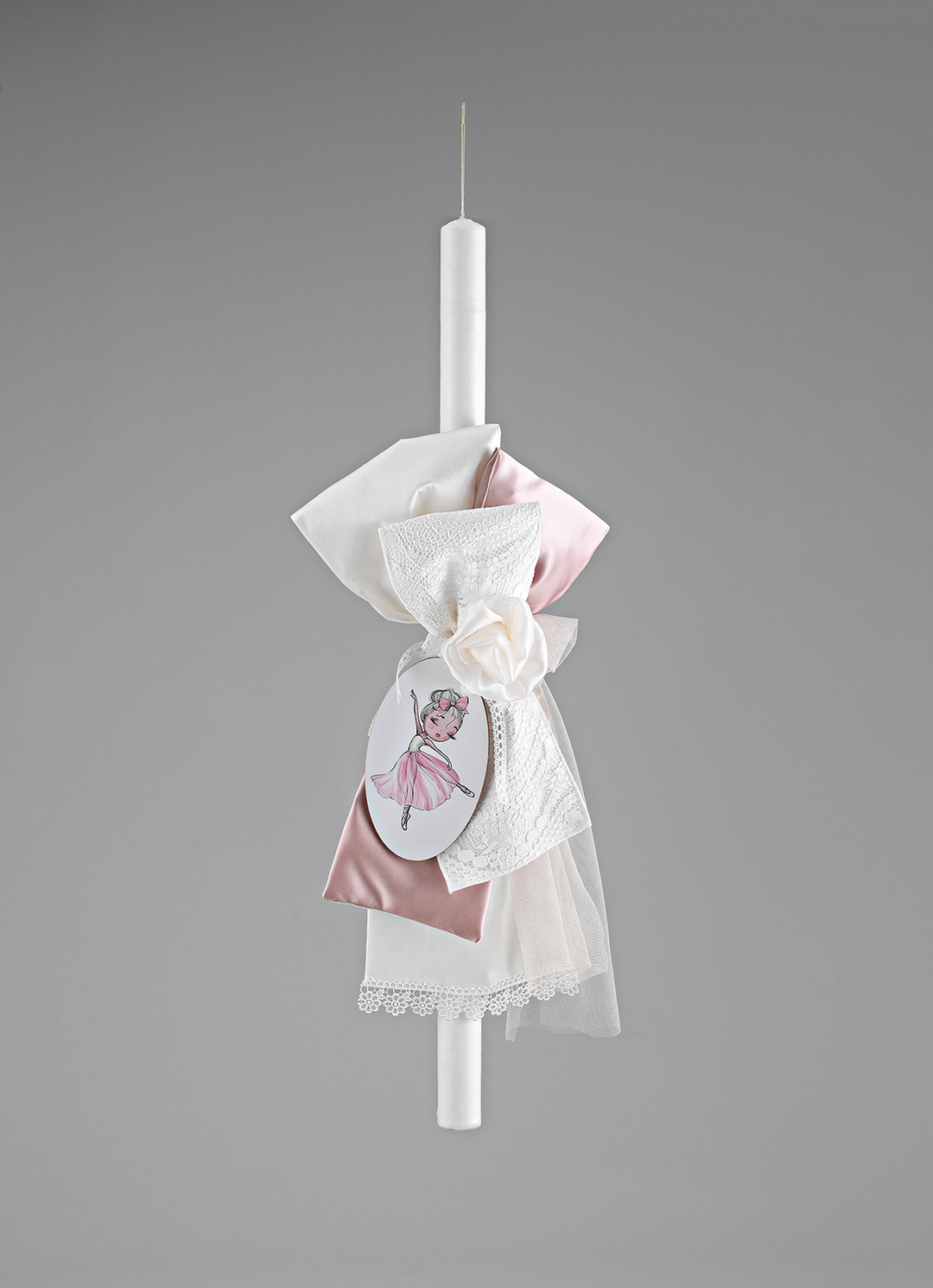 Η λαμπάδα είναι διακοσμημένη με στρώσεις από απαλό ροζ και λευκό σατέν ύφασμα, δημιουργώντας μια αίσθηση πολυτέλειας και κομψότητας. Οι δαντελένιες λεπτομέρειες και οι τούλινες προσθήκες, προσθέτουν μια ρομαντική και αέρινη νότα, ενώ το χειροποίητο τριαντάφυλλο ολοκληρώνει το σύνολο με μια διακριτική και κομψή πινελιά.