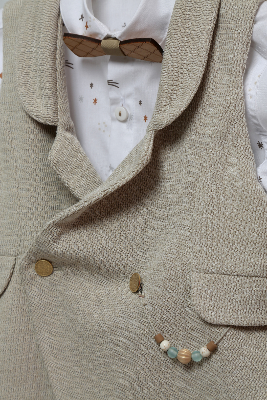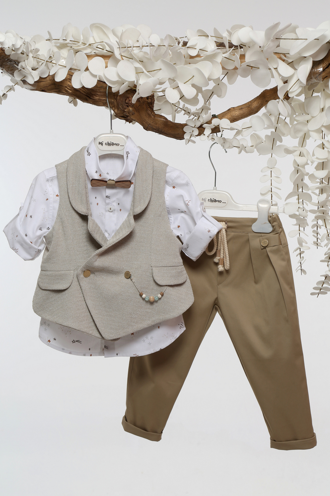 Ένα βαπτιστικό σετ υψηλής αισθητικής που συνδυάζει την κομψότητα με τη διαχρονική πολυτέλεια. Το σύνολο περιλαμβάνει ένα λευκό πουκάμισο με διακριτικά αστεράκια σε μπεζ και καφέ αποχρώσεις, χαρίζοντας μια παιχνιδιάρικη πινελιά στο ντύσιμο. Το ιδιαίτερο γιλέκο σε ανοιχτό μπεζ διαθέτει διακοσμητική αλυσίδα με ξύλινες και γυάλινες χάντρες, προσφέροντας μια μοναδική vintage νότα. Το παντελόνι σε γήινη καφέ απόχρωση διαθέτει ιδιαίτερες λεπτομέρειες, όπως διακοσμητικά κουμπιά και κορδόνι στη μέση, για τέλεια εφαρμογή. Ολοκληρώνεται με ένα φινετσάτο παπιγιόν σε φυσικό χρώμα, που προσδίδει έξτρα στυλ. Ένα βαπτιστικό σύνολο που αποπνέει κομψότητα, ιδανικό για τους μικρούς κυρίους που θέλουν να ξεχωρίζουν!