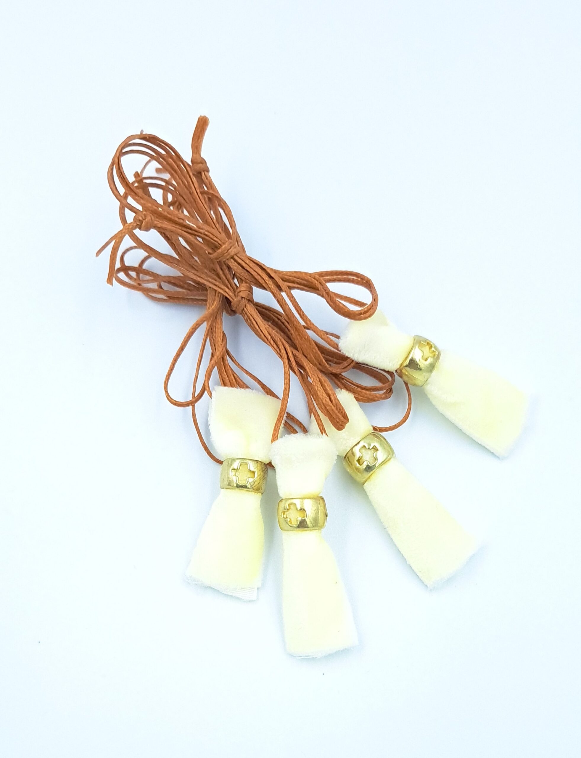 Μαρτυρικό κολιέ ταμπά κορδόνι, εκρού βελούδο, σταυρός χρυσός χρώμα. Οι φωτογραφίες έχουν υποστεί επεξεργασία και τα χρώματα ίσως να διαφέρουν λίγο στην πραγματικότητα. Η τιμή αφορά συσκευασία 50 τεμαχίων.