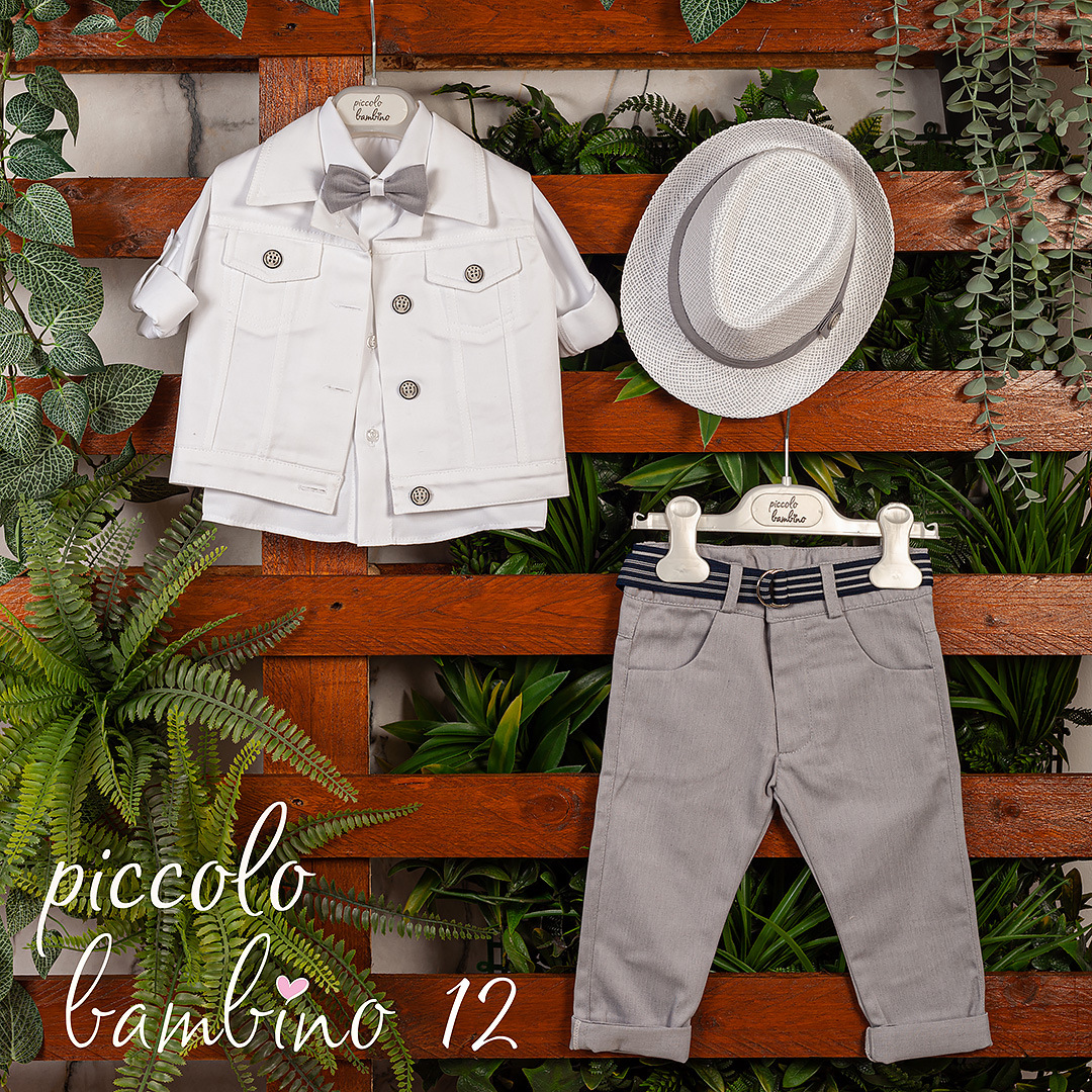 Ένα κομψό και μοντέρνο βαπτιστικό σετ για αγόρι, αποτελούμενο από λευκό σακάκι με παπιγιόν,  παντελόνι και ασορτί καπέλο. Ιδανικό για μια στυλάτη και άνετη εμφάνιση στην ξεχωριστή ημέρα της βάπτισης.