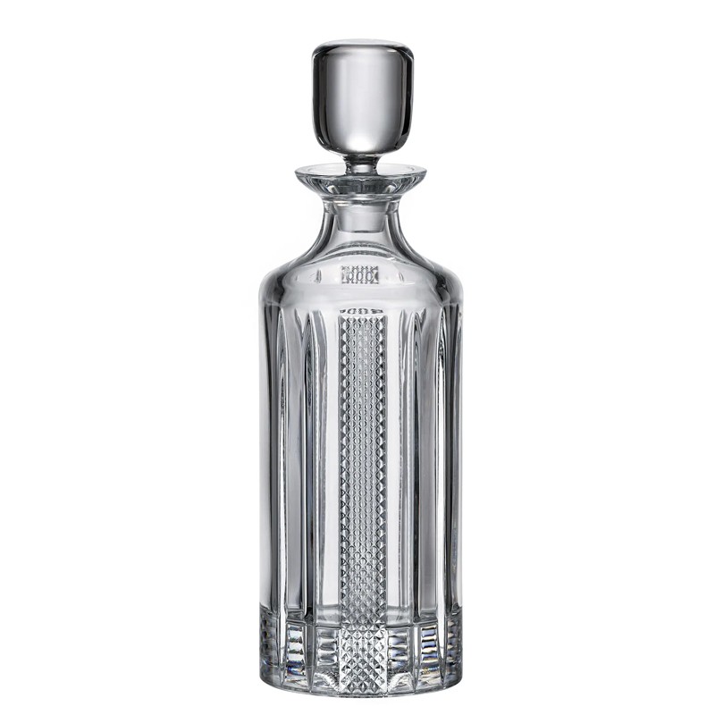 Μια κομψή κρυστάλλινη καράφα με λεπτομερείς χαράξεις και στρογγυλό καπάκι, που αποπνέει αριστοκρατική γοητεία και φινέτσα.