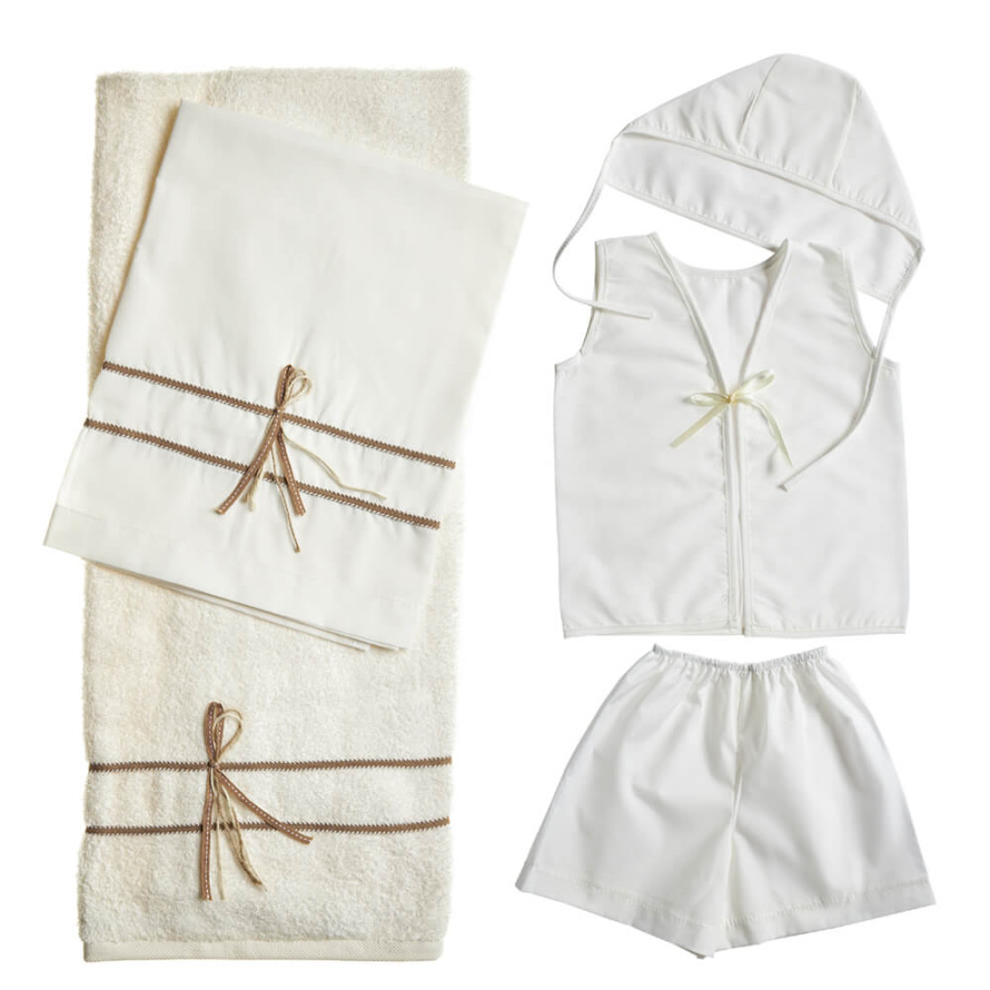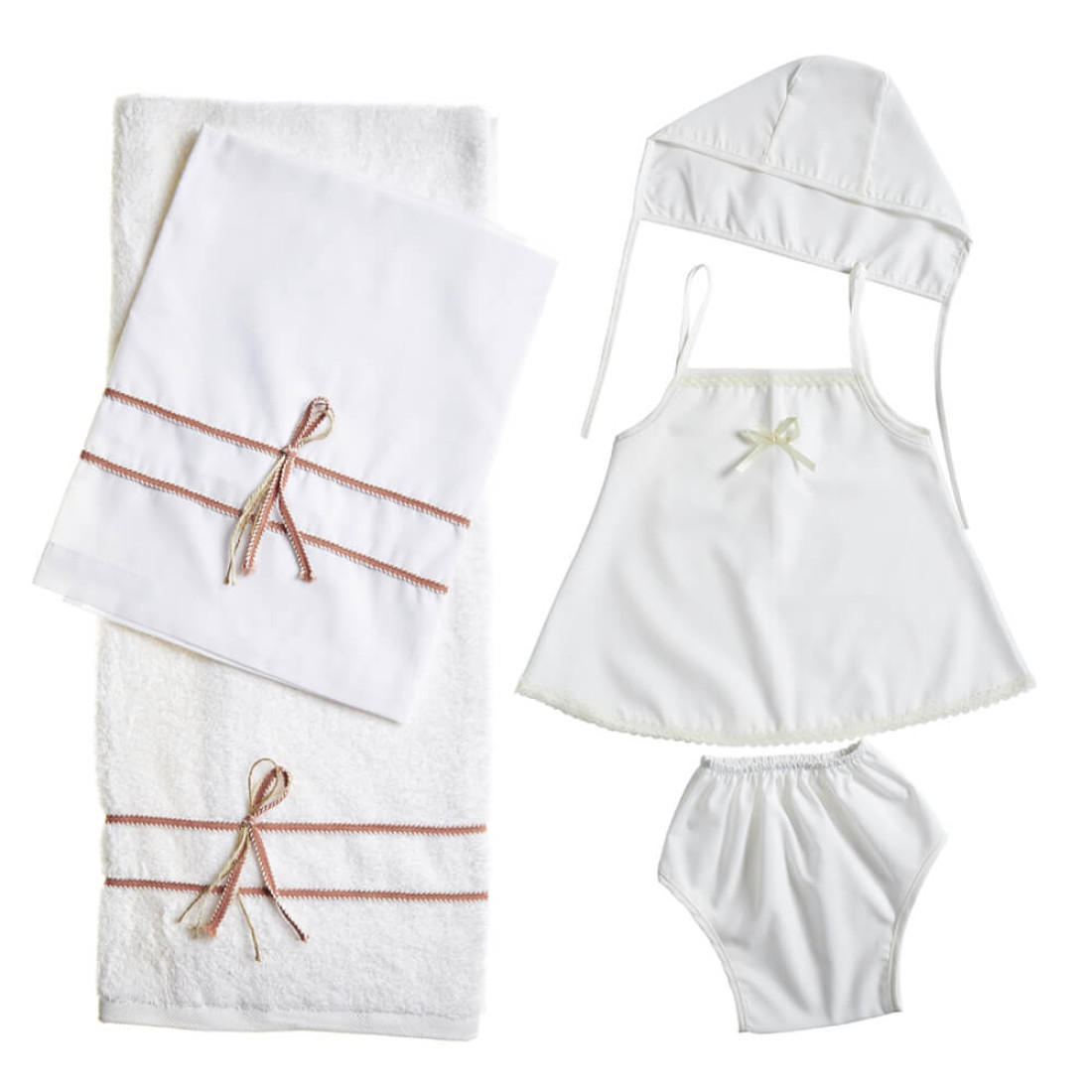 Κομψό σετ λαδόπανου βάπτισης σε εκρού αποχρώσεις, με διακριτικές rustic λεπτομέρειες από φυσικό κορδόνι. Περιλαμβάνει πετσέτα, σεντόνι, πανάκι, γιλεκάκι, σορτσάκι και καπελάκι, ιδανικό για μια λιτή και κλασική βάπτιση.