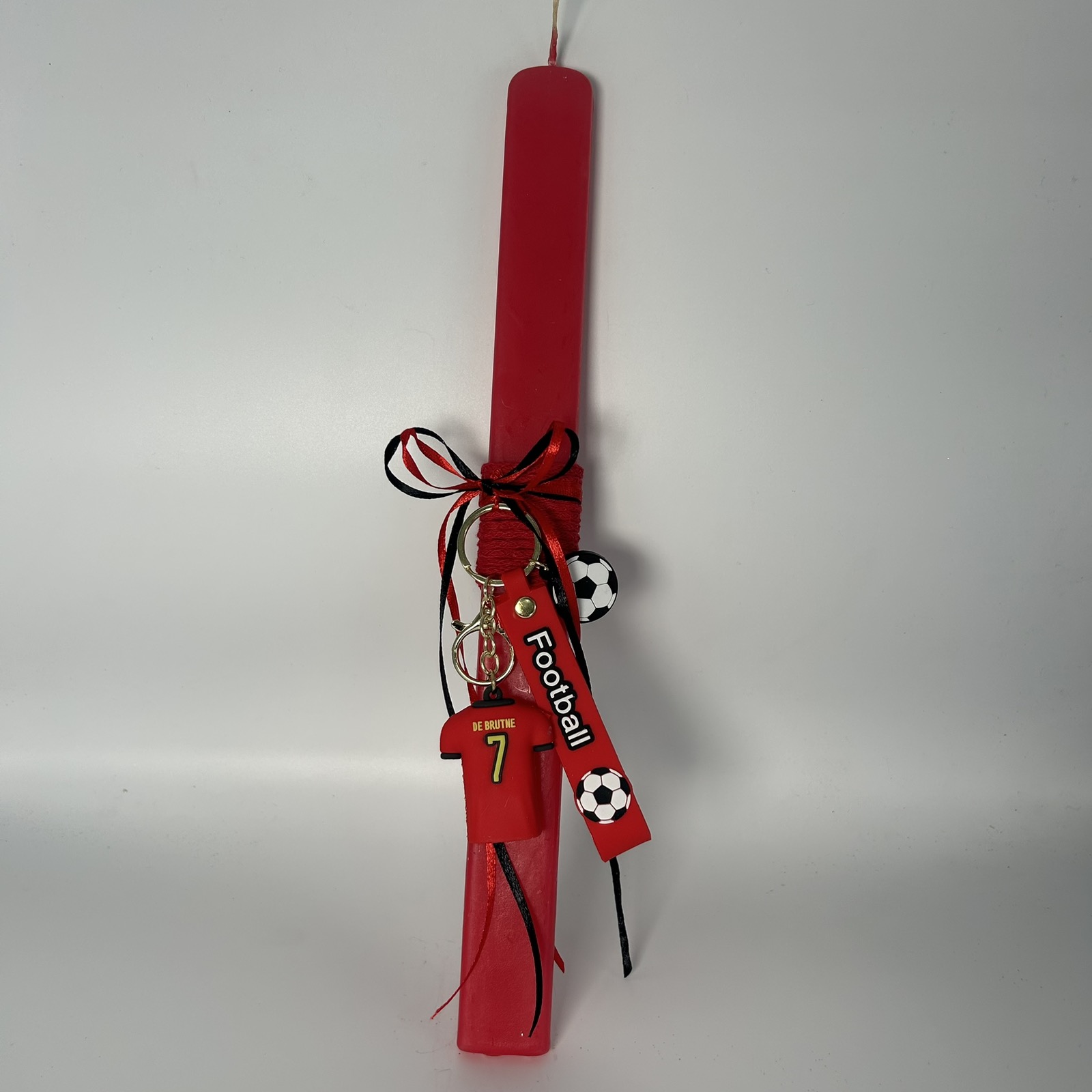 Αυτή η μοναδική, χειροποίητη πασχαλινή λαμπάδα είναι το ιδανικό δώρο για κάθε ποδοσφαιρόφιλο και θαυμαστή του Kevin De Bruyne! Διακοσμημένη με ένα μπρελόκ που απεικονίζει τη φανέλα του διάσημου ποδοσφαιριστή με τον αριθμό 7 και το όνομά του, καθώς και με μια μπάλα ποδοσφαίρου, φέρνει μια δόση ποδοσφαιρικής μαγείας στο πασχαλινό τραπέζι. Οι κορδέλες στα χρώματα της ομάδας και η επιγραφή “Football” προσθέτουν μια επιπλέον πινελιά ενθουσιασμού. Κάθε λεπτομέρεια είναι φτιαγμένη με μεράκι, καθιστώντας την ένα ξεχωριστό δώρο που θα ενθουσιάσει κάθε φίλο του ποδοσφαίρου.