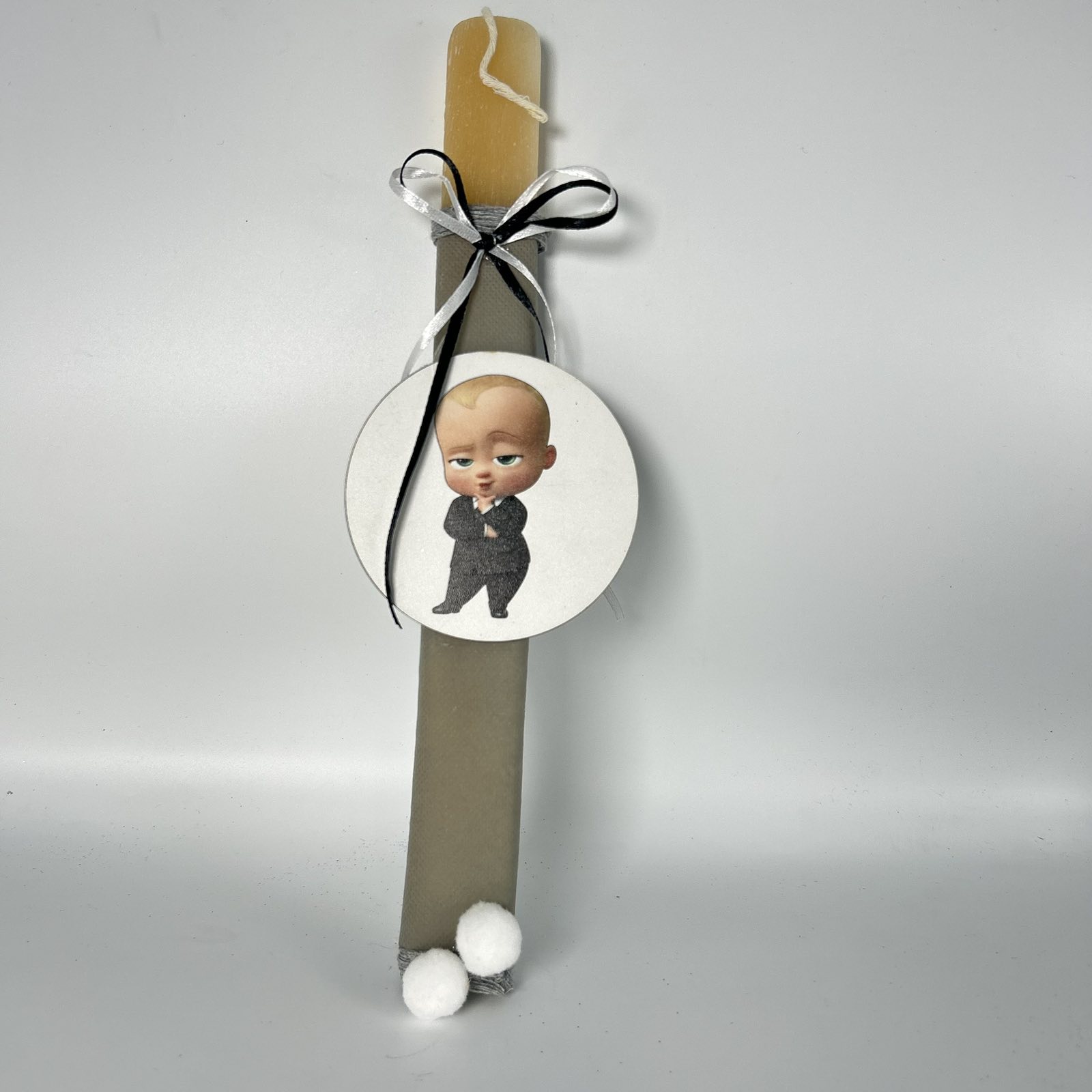 Μια εντυπωσιακή πασχαλινή λαμπάδα σε γκρι αποχρώσεις, διακοσμημένη με τον αγαπημένο Boss Baby! Με κομψό φιόγκο σε μαύρο-λευκό και μοντέρνο design, είναι η ιδανική επιλογή για μικρούς fans του ατρόμητου μωρού με το κοστούμι! 🍼👔✨