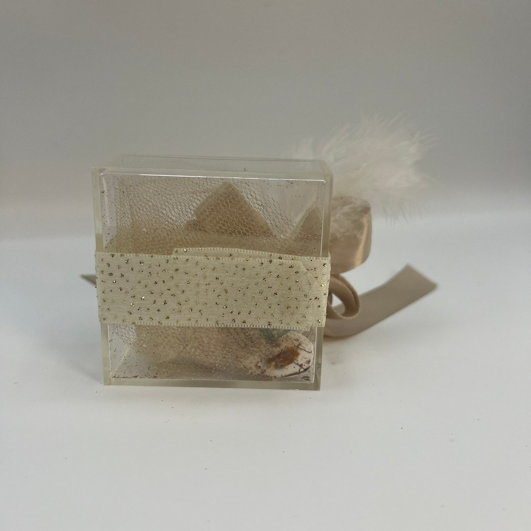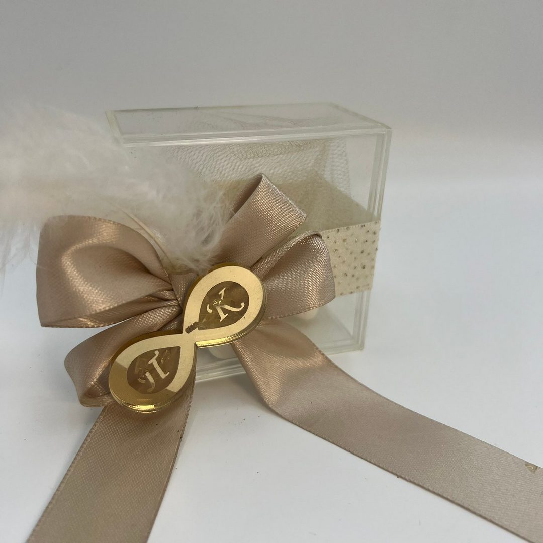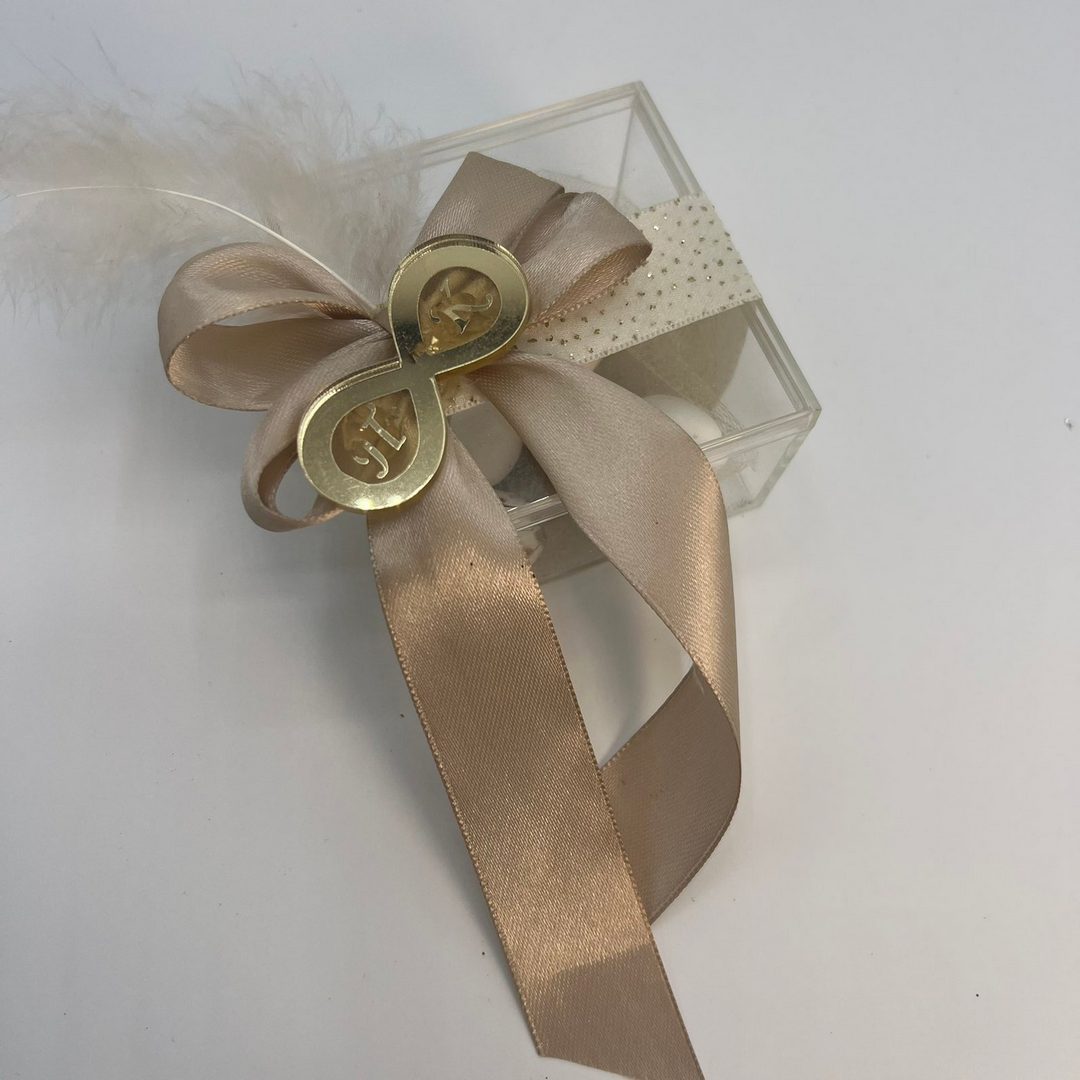 Μια ρομαντική και κομψή μπομπονιέρα γάμου σε μορφή κουτιού, διακοσμημένη με φίνα δαντέλα και έναν φινετσάτο φιόγκο. Στην κορυφή της ξεχωρίζει το σύμβολο του απείρου, που συμβολίζει την αιώνια αγάπη, με τα αρχικά του ζευγαριού ενσωματωμένα μέσα του. Στο εσωτερικό του κουτιού βρίσκονται κουφέτα, προσφέροντας μια γλυκιά ανάμνηση της ξεχωριστής αυτής στιγμής.