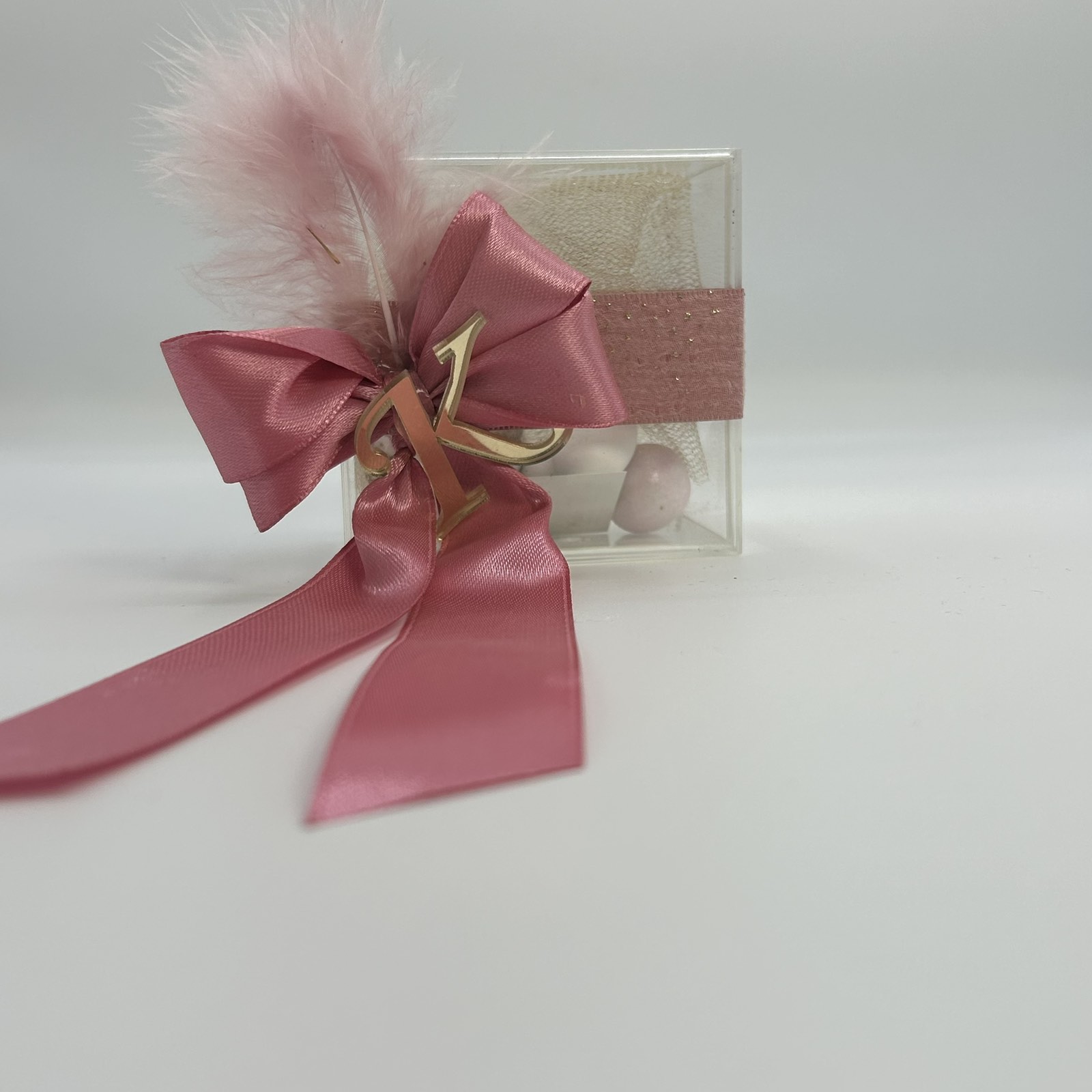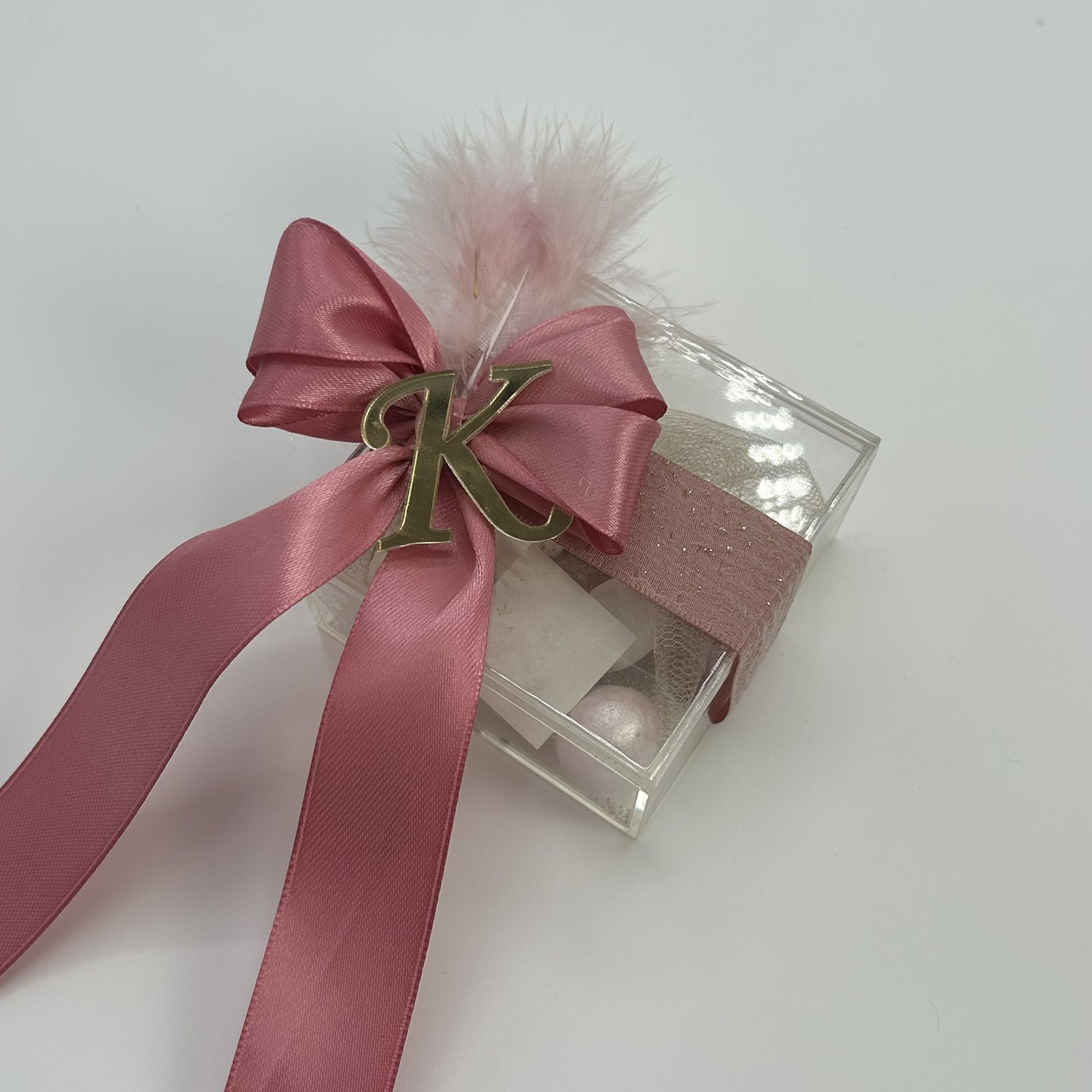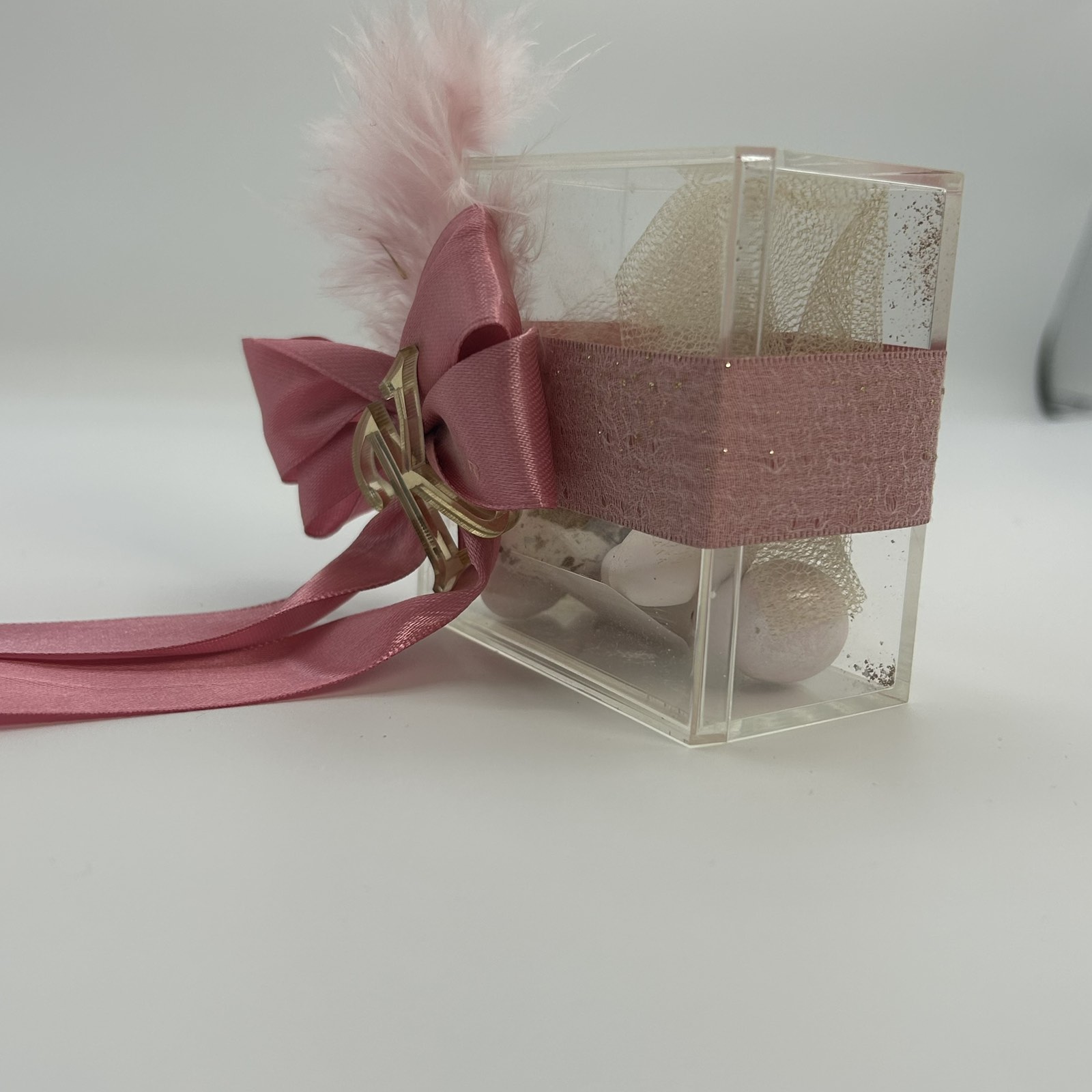 Μπομπονιέρα γάμου κουτάκι plexi με δέσιμο μεγάλο φιόγκο και μονόγραμμα