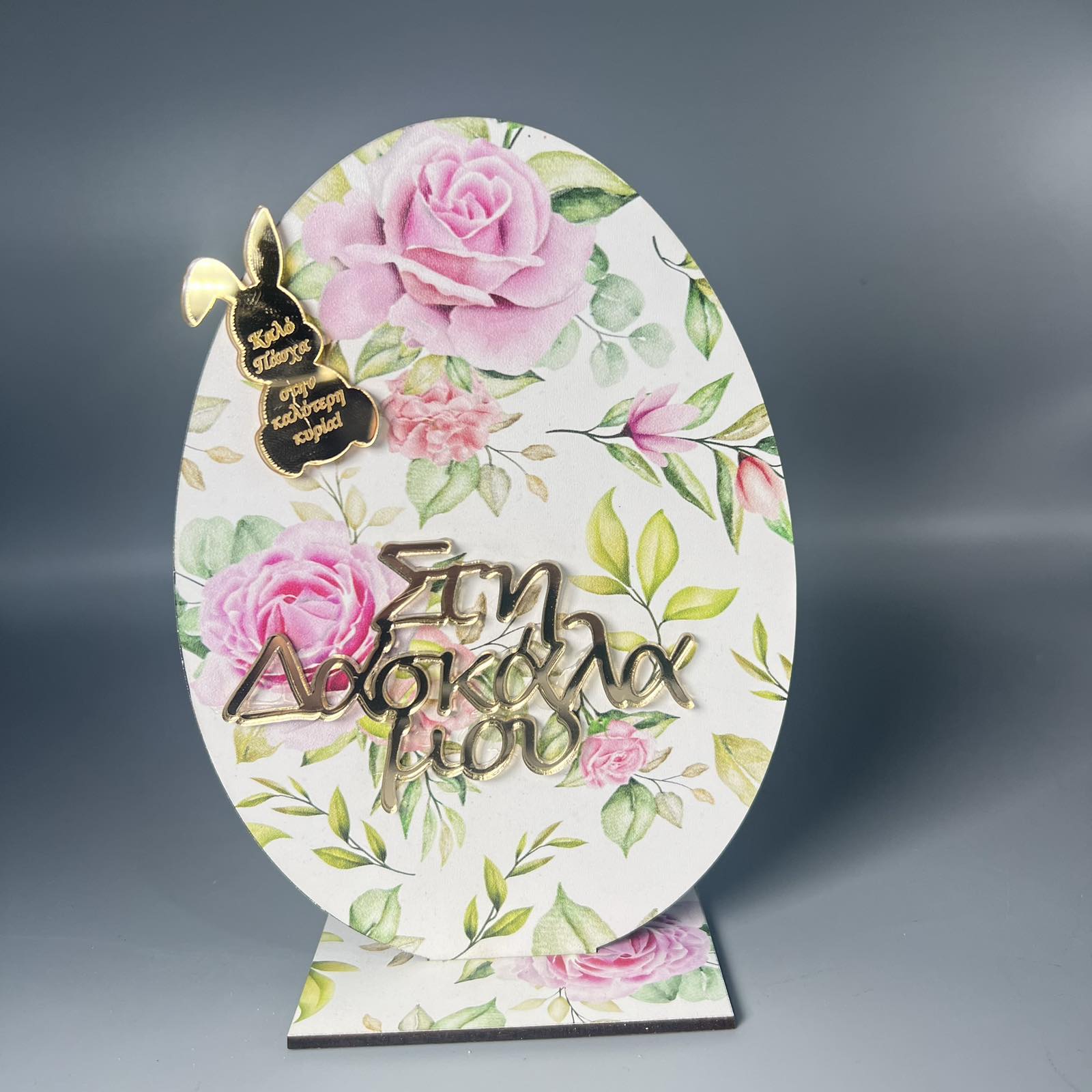 Ένα μοναδικό ξύλινο διακοσμητικό σε σχήμα πασχαλινού αυγού, στολισμένο με τρυφερές ροζ τριανταφυλλιές και χρυσές ευχές, ιδανικό για να εκφράσετε την αγάπη και την εκτίμησή σας στη δασκάλα σας. Ένα χειροποίητο δώρο που θα στολίσει με ζεστασιά και χρώμα κάθε χώρο.