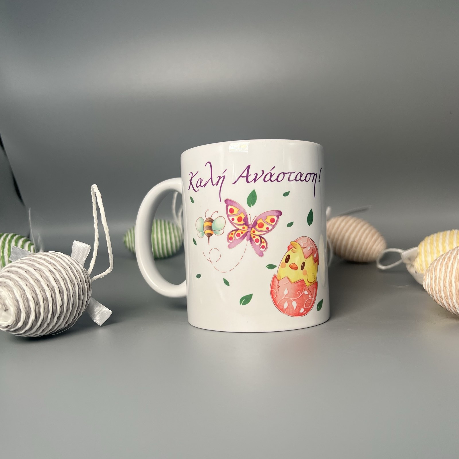 Λευκή κούπα με πασχαλινά σχέδια (πεταλούδα, μελισσάκι, νεοσσός) και χειρόγραφη ευχή “Καλή Ανάσταση!”. Ιδανικό πασχαλινό δώρο.