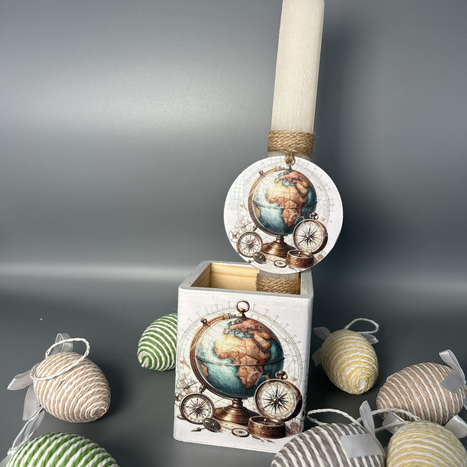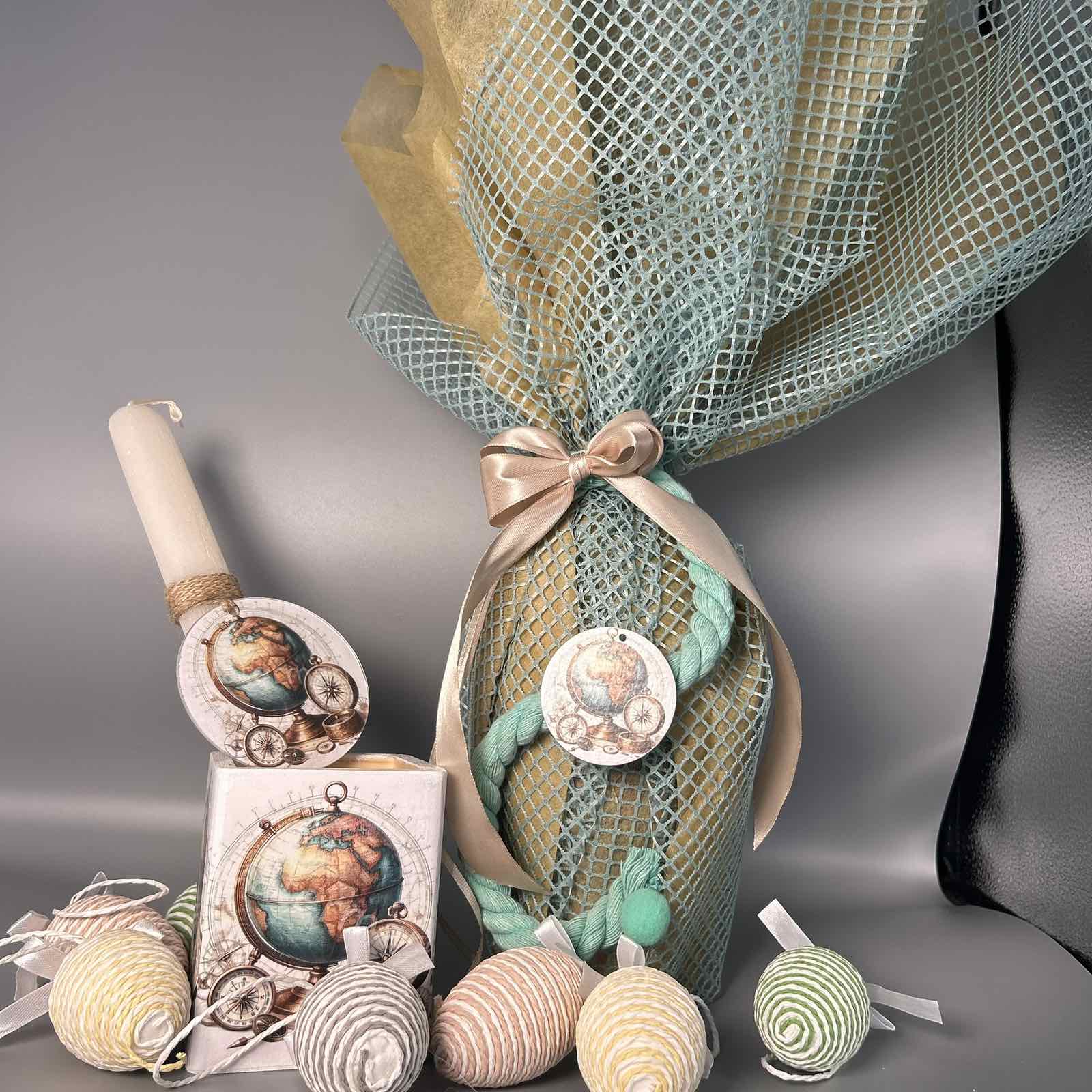 Αυτή η λαμπάδα είναι ένα ταξίδι στον κόσμο! Με ένα ρουστίκ κερί, ένα κουτί και διακοσμητικά αυγά με θεματικό χάρτη, είναι το τέλειο δώρο για κάθε ταξιδιώτη. Οι γήινοι τόνοι και τα φυσικά υλικά προσδίδουν μια αίσθηση περιπέτειας και εξερεύνησης.
