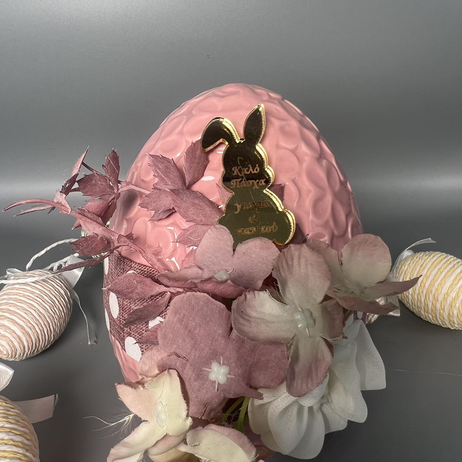 Στο κέντρο του αυγού, μια σύνθεση από τεχνητά άνθη και καρπούς σε απαλές ροζ αποχρώσεις, τυλιγμένη με μια λεπτή, ροζ κορδέλα, προσθέτει μια γλυκιά και ρομαντική πινελιά. Τα πράσινα, τεχνητά φύλλα που πλαισιώνουν τα άνθη, δημιουργούν μια αντίθεση που αναδεικνύει την ομορφιά τους.