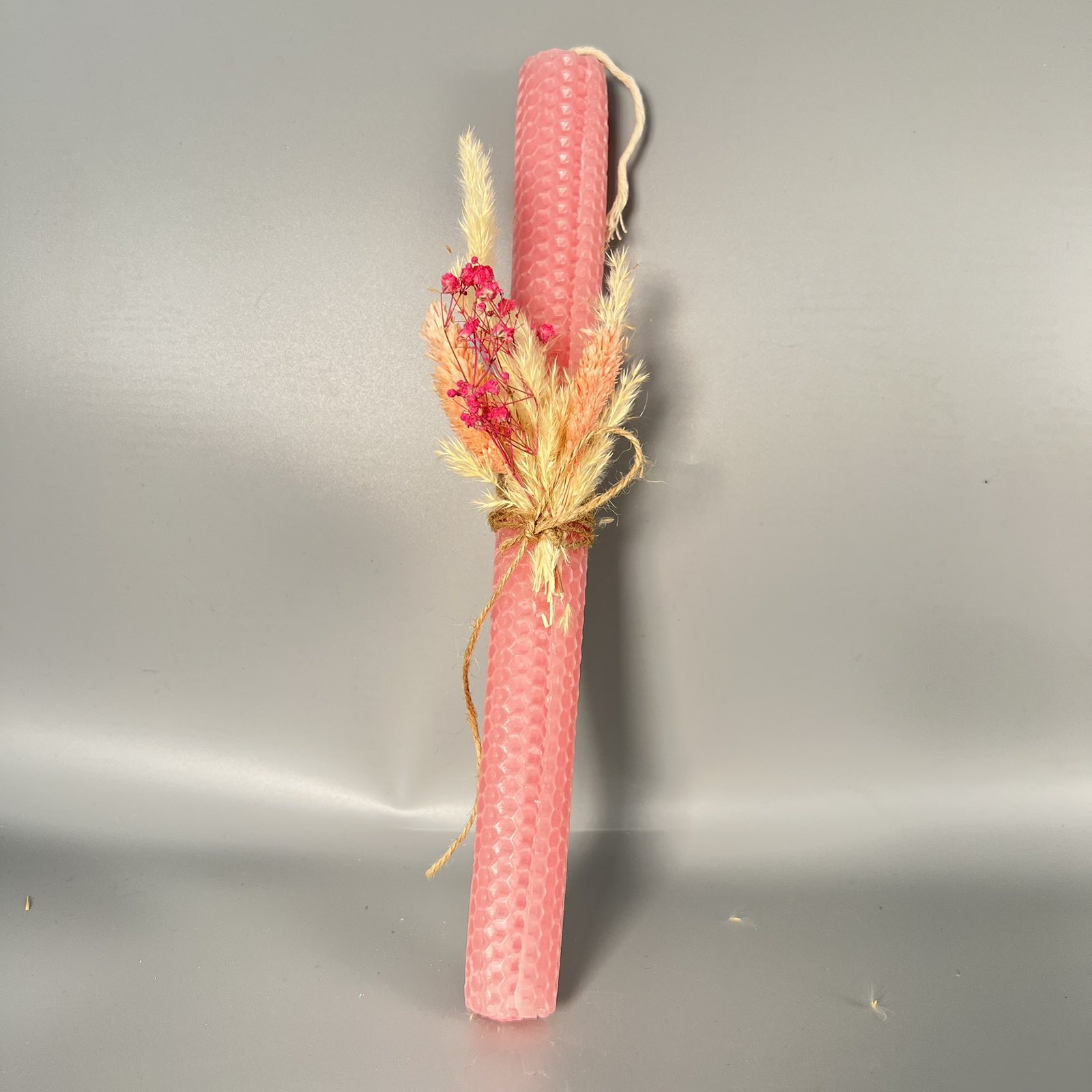 Αυτή η υπέροχη χειροποίητη λαμπάδα είναι φτιαγμένη από αγνό κερί μελιού, προσφέροντας ένα διακριτικό και φυσικό άρωμα που θυμίζει την αυθεντικότητα της παράδοσης. Το απαλό ροζ χρώμα της χαρίζει μία ρομαντική και κομψή αίσθηση, ενώ ο προσεγμένος χειροποίητος στολισμός με αποξηραμένα λουλούδια και φυσικά στοιχεία την καθιστά μοναδική. Το διακοσμητικό δέσιμο με σχοινί γιούτας συμπληρώνει την αισθητική της, κάνοντάς την ιδανική επιλογή για μια ξεχωριστή λαμπάδα που θα φωτίσει το βράδυ της Ανάσταση.