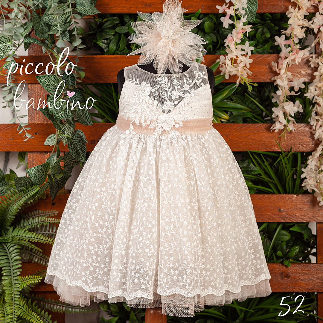 Αυτό το βαπτιστικό φόρεμα είναι η απόλυτη επιλογή για μια ξεχωριστή περίσταση. Ο συνδυασμός του ιβουάρ με τις ροζ-μπεζ αποχρώσεις δημιουργεί μια αίσθηση διαχρονικής κομψότητας, ενώ η φίνα δαντέλα που καλύπτει όλο το φόρεμα χαρίζει μια παραμυθένια όψη.
