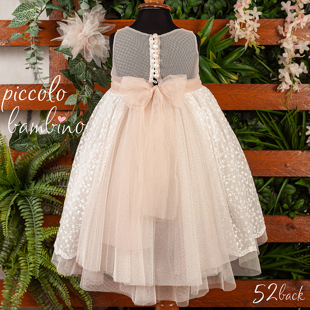 Ένα ονειρικό βαπτιστικό φόρεμα σε απαλές ροζ-μπεζ αποχρώσεις, διακοσμημένο με φίνα δαντέλα και ανάγλυφα κεντήματα. Η σατέν ζώνη με διακριτικά λουλούδια προσθέτει ρομαντική κομψότητα, ενώ το τούλινο τελείωμα δημιουργεί μια πλούσια και αέρινη αίσθηση.