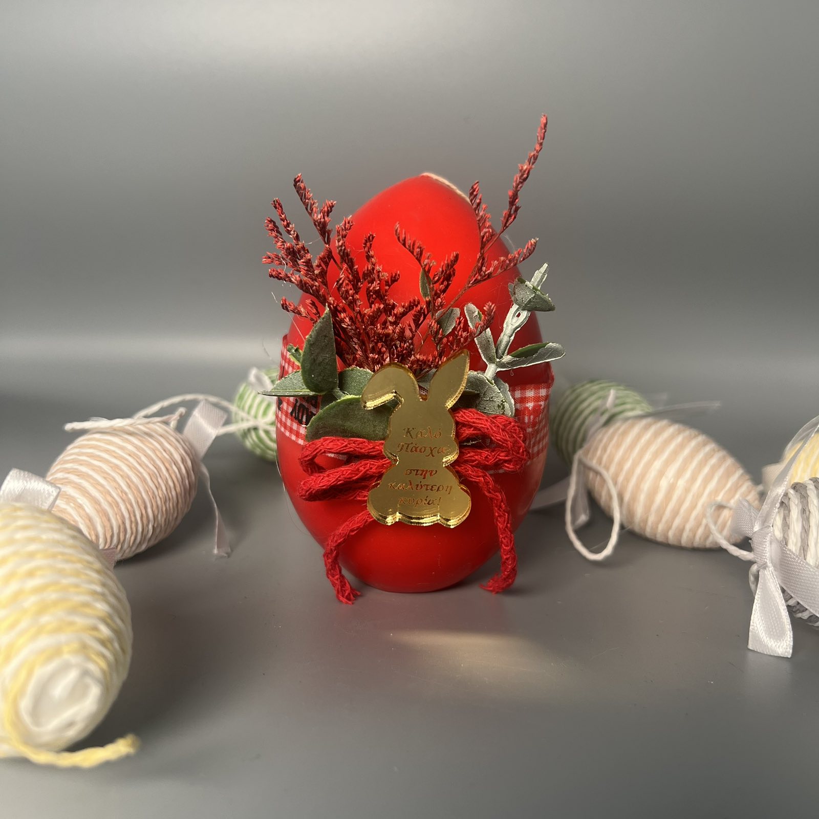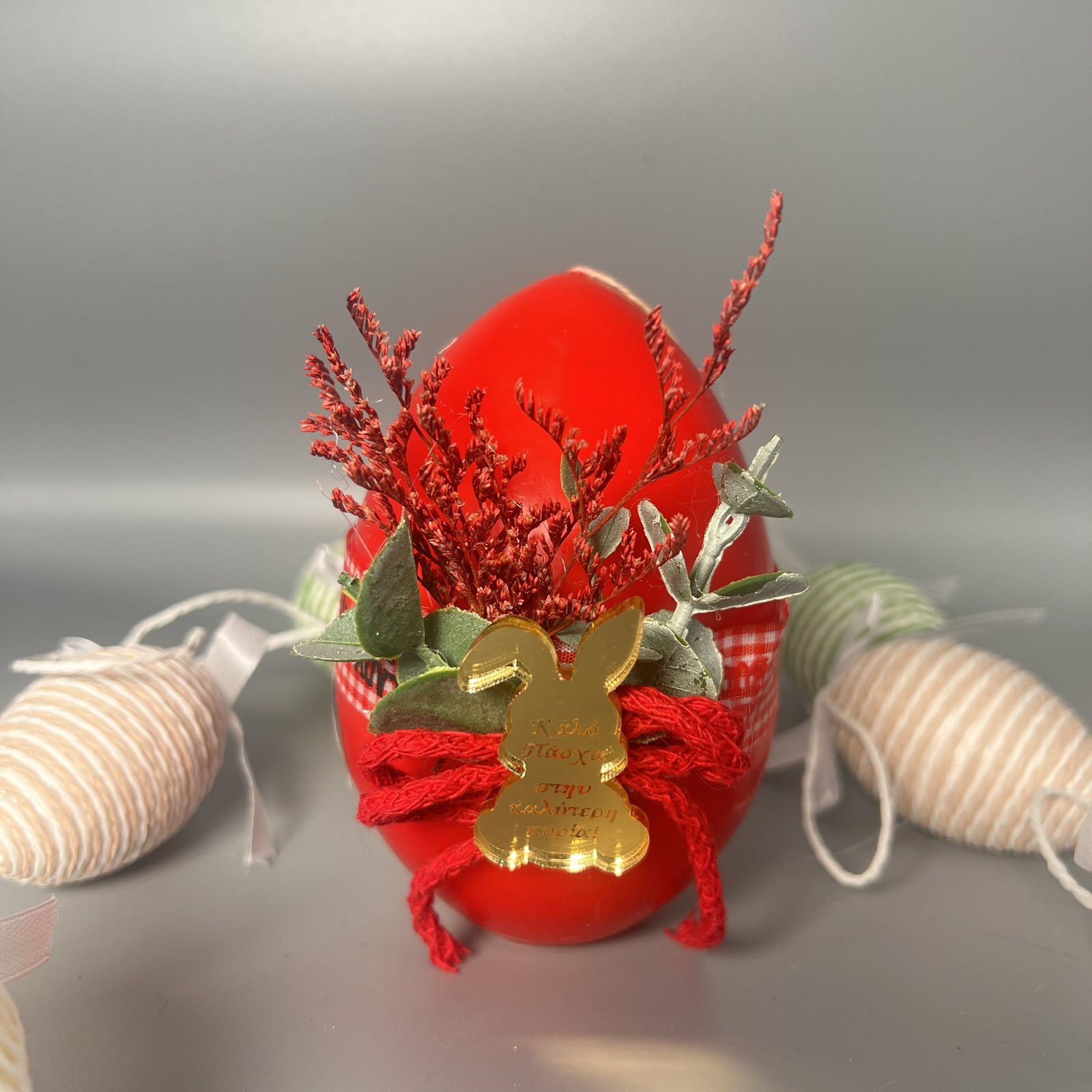 Αυτό το χειροποίητο κερί αποτελεί ένα μοναδικό δώρο για το Πάσχα, καθώς συνδυάζει την αισθητική με τη λειτουργικότητα. Το κερί είναι σμιλεμένο σε σχήμα πασχαλινού αυγού και διακοσμημένο με κόκκινα λουλούδια και ένα χρυσό λαγουδάκι με ευχή, προσδίδοντας μια αίσθηση κομψότητας και ζεστασιάς. Η φλόγα του κεριού φωτίζει απαλά το χώρο, δημιουργώντας μια ατμόσφαιρα χαλάρωσης και γιορτής. Μετά την καύση του κεριού, το πασχαλινό αυγό μπορεί να χρησιμοποιηθεί ως διακοσμητικό, προσθέτοντας μια όμορφη πινελιά στην πασχαλινή διακόσμηση. Επιπλέον, υπάρχει η δυνατότητα να προστεθούν πάνω στο αυγό διάφορα διακοσμητικά, όπως κορδέλες, πέρλες ή άλλα λουλούδια, σύμφωνα με τις προτιμήσεις του πελάτη. Επίσης, μπορεί να προστεθεί ένα μικρό λαγουδάκι με ευχή για “Καλό Πάσχα”, κάνοντας το δώρο ακόμα πιο προσωπικό και ξεχωριστό. Το σετ πλαισιώνεται από μικρά, σχοινένια πασχαλινά αυγά σε φυσικές αποχρώσεις, δημιουργώντας μια αρμονική σύνθεση. Είναι ιδανικό για όσους εκτιμούν τα χειροποίητα αντικείμενα και την όμορφη διακόσμηση.