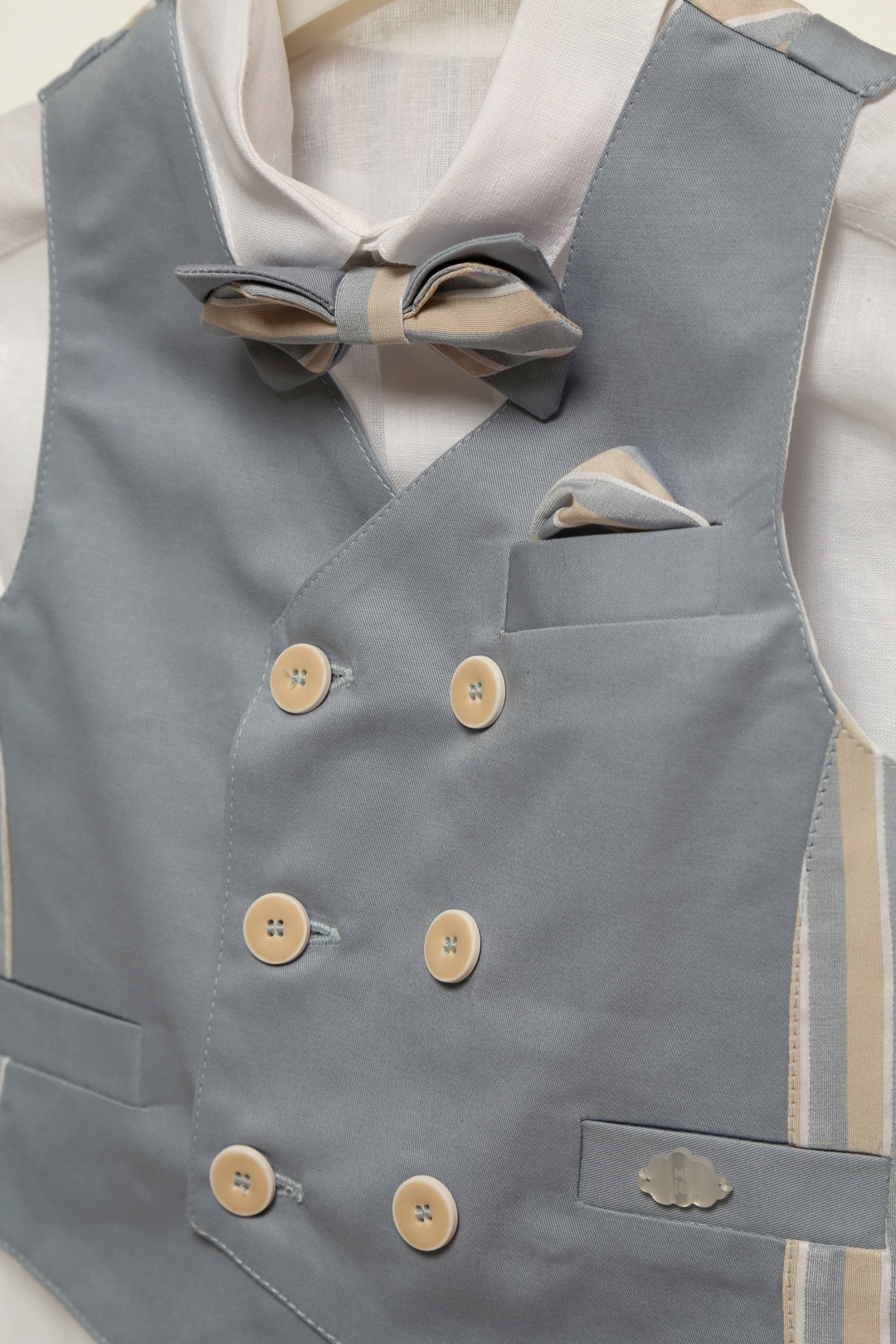 Ένα κομψό βαπτιστικό σύνολο για αγόρι, που περιλαμβάνει λευκό πουκάμισο, γαλάζιο γιλέκο, γκρι παπιγιόν και λευκό παντελόνι με κορδόνι. Ιδανικό για μια ιδιαίτερη περίσταση.