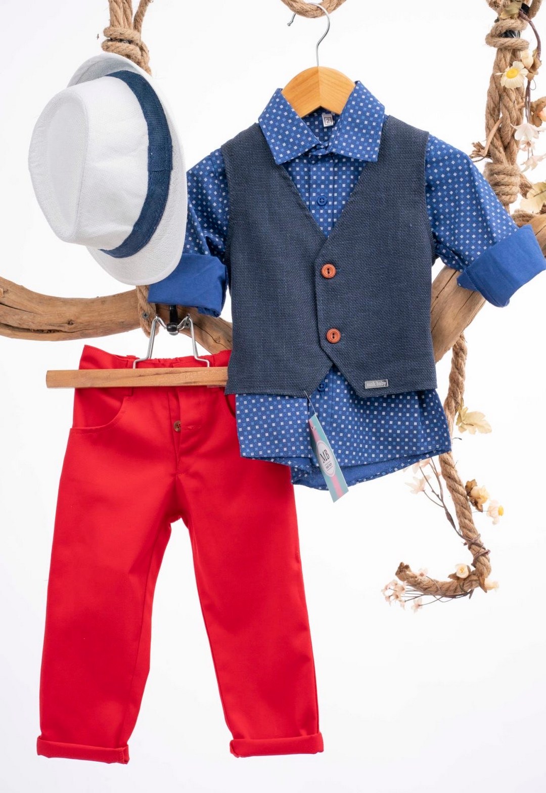 Αυτό το ξεχωριστό βαπτιστικό σετ για αγόρι αποπνέει μια αίσθηση ναυτικής κομψότητας, ιδανικό για μια καλοκαιρινή ή ανοιξιάτικη βάπτιση. Το σετ περιλαμβάνει ένα μπλε πουκάμισο με διακριτικό μοτίβο, ένα σκούρο μπλε γιλέκο με διακριτικά κουμπιά, ένα κόκκινο παντελόνι και ένα λευκό καπέλο με μπλε λεπτομέρειες. Η χρωματική παλέτα είναι ζωηρή και παιχνιδιάρικη, ενώ τα υφάσματα είναι υψηλής ποιότητας, εξασφαλίζοντας άνεση και κομψότητα καθ’ όλη τη διάρκεια της τελετής. Αυτό το σετ είναι ιδανικό για μια βάπτιση με ναυτικό θέμα ή για μια πιο μοντέρνα και παιχνιδιάρικη εμφάνιση, και θα δημιουργήσει αξέχαστες αναμνήσεις.