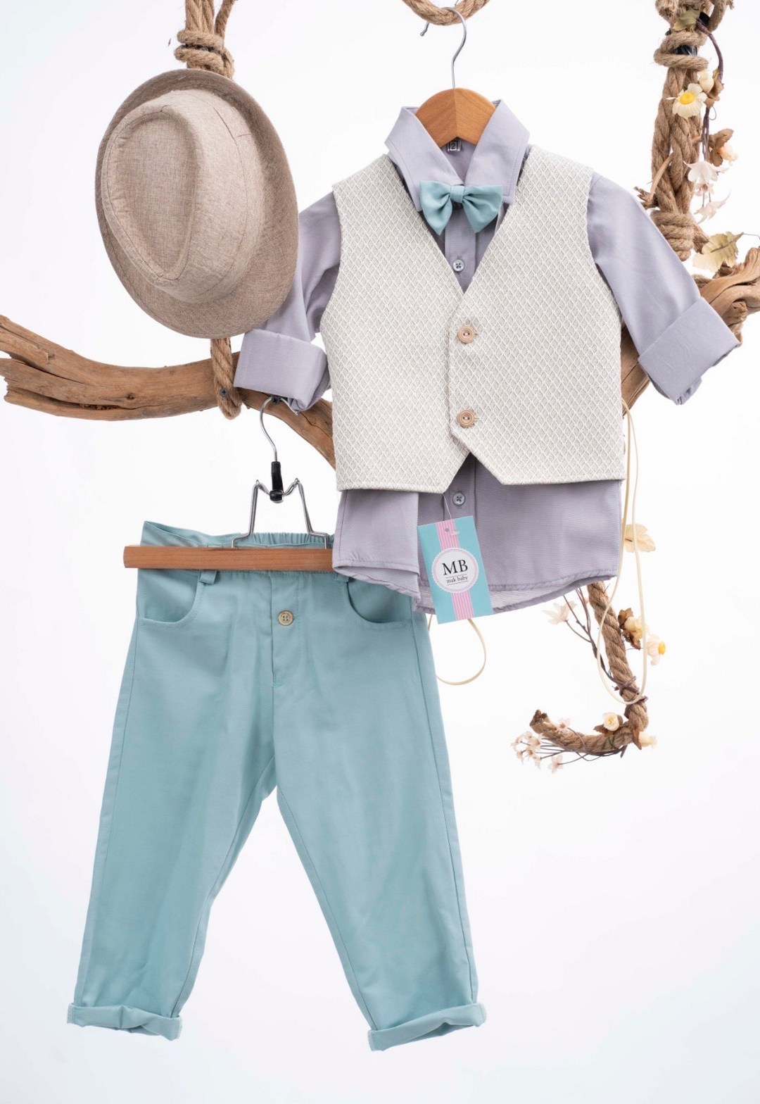 Απαλό βαπτιστικό σετ για αγόρι, με γκρι πουκάμισο, λευκό γιλέκο, γαλάζιο παπιγιόν, γαλάζιο παντελόνι και μπεζ καπέλο. Ιδανικό για μια ανοιξιάτικη ή καλοκαιρινή βάπτιση.