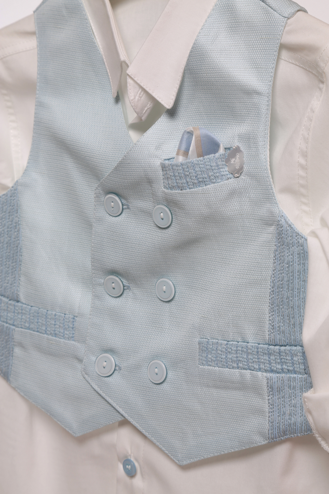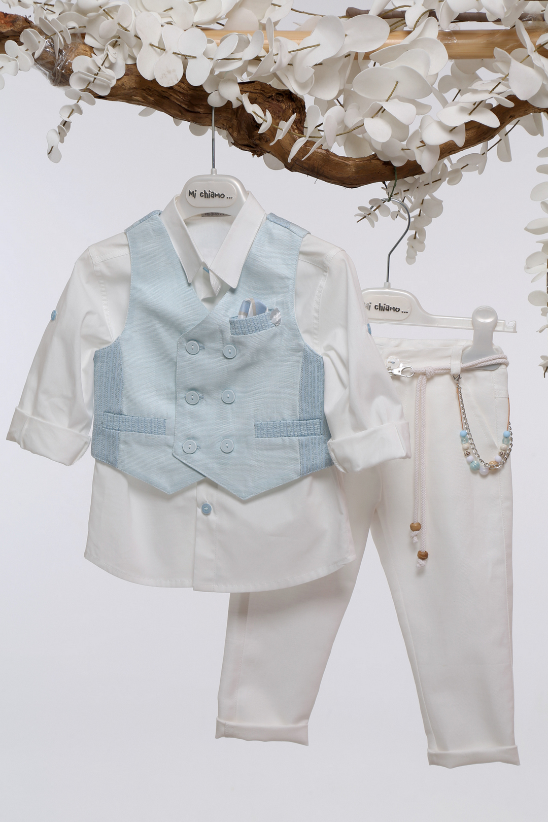 Ένα υπέροχο βαπτιστικό σετ για αγόρια, που συνδυάζει την κομψότητα με τη διαχρονική φινέτσα. Το σύνολο αποτελείται από ένα εκρού πουκάμισο με κουμπιά σε απαλό σιέλ χρώμα, δίνοντας μια διακριτική πινελιά χρώματος. Το διπλόπετο γιλέκο σε ανοιχτό σιέλ με λεπτομέρειες σε υφαντό ύφασμα χαρίζει μια αριστοκρατική αίσθηση, ενώ η τσέπη με διακοσμητικό μαντηλάκι προσθέτει μια πινελιά κομψότητας. Το εκρού παντελόνι διαθέτει κορδόνι και διακοσμητική αλυσίδα με χάντρες, που ενισχύει το στυλ και την ιδιαίτερη αισθητική του συνόλου. Ιδανικό για μια ξεχωριστή βάπτιση με διακριτική πολυτέλεια και απαράμιλλη γοητεία!
