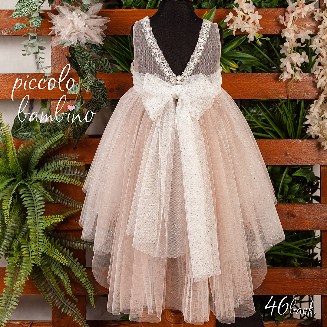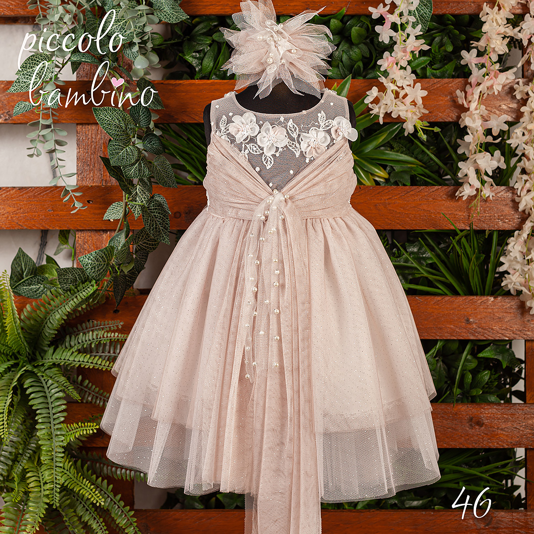 Αυτό το αριστοκρατικό βαπτιστικό φόρεμα συνδυάζει τη ρομαντική κομψότητα με τη διαχρονική φινέτσα. Σε μια απαλή σαμπανιζέ απόχρωση, το φόρεμα διαθέτει ένα ιδιαίτερο μπούστο από φίνα διαφάνεια, στολισμένο με περίτεχνα λουλούδια δαντέλας και διακριτικές πέρλες που προσδίδουν μια αίσθηση πολυτέλειας.