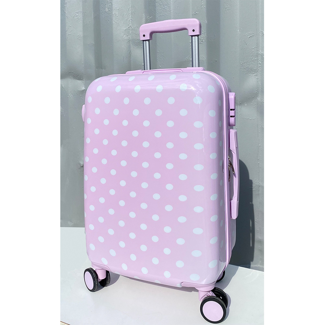 Το κύριο διακοσμητικό στοιχείο είναι οι λευκές πουά που καλύπτουν όλη την επιφάνεια της βαλίτσας. Αυτό το σχέδιο προσθέτει μια παιχνιδιάρικη και διαχρονική αισθητική, που ταιριάζει απόλυτα σε μια βάπτιση.