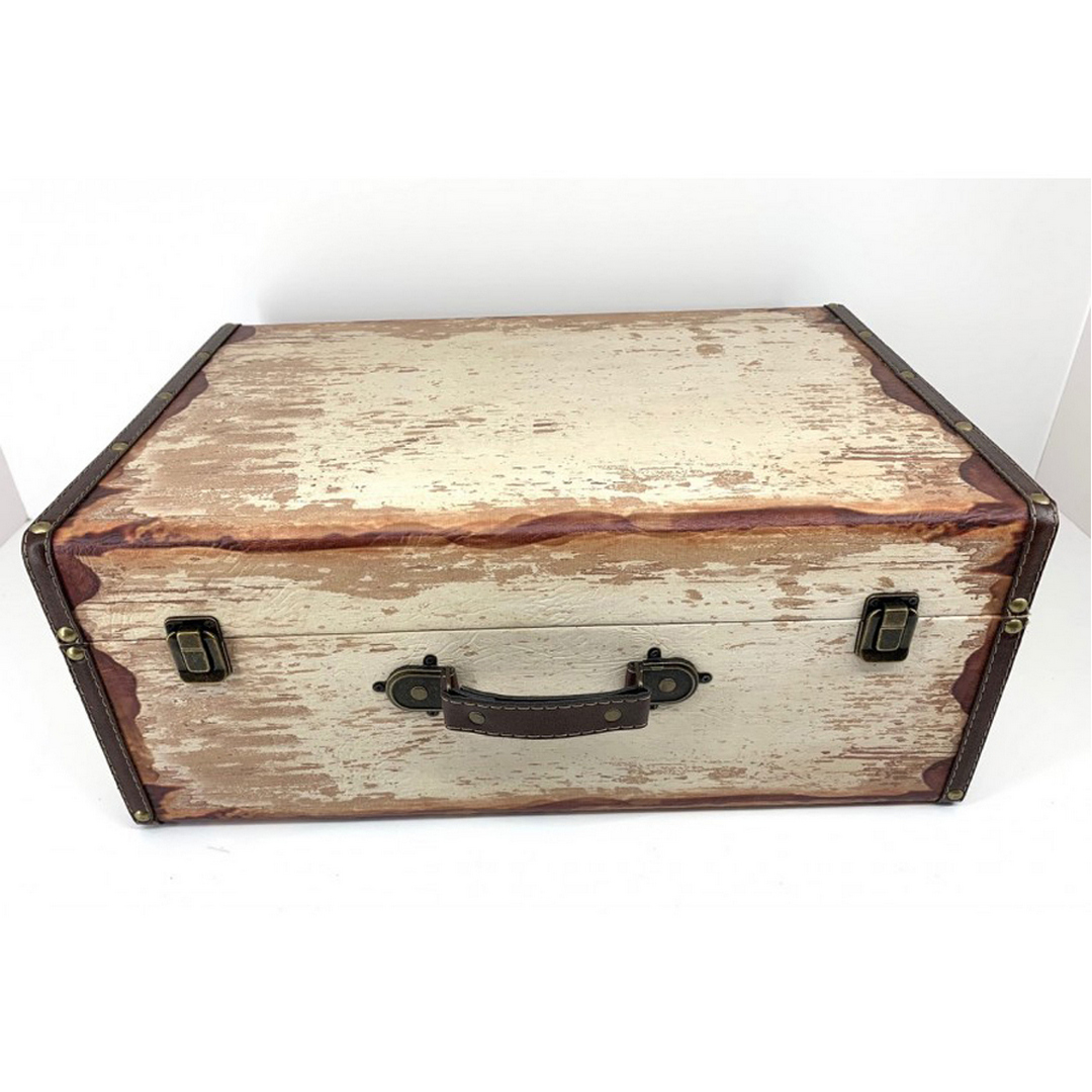 Μια vintage βαλίτσα βάπτισης με ξύλινη εμφάνιση, μεταλλικά κουμπώματα και δερμάτινη λαβή. Έχει μια ρετρό και κομψή εμφάνιση, ιδανική για αγόρι ή κορίτσι.