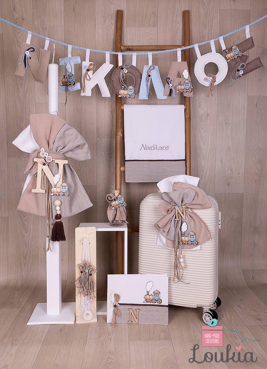 Η εικόνα αποτυπώνει την ατμόσφαιρα μιας βάπτισης με θέμα τα τρενάκια και την ταξιδιάρικη διάθεση, όπου η λεπτομέρεια και η αγάπη για το χειροποίητο είναι εμφανείς. Στο κέντρο της σύνθεσης, μια ξύλινη σκάλα φιλοξενεί μια λευκή πετσέτα βάπτισης, διακοσμημένη με γήινες λεπτομέρειες και το όνομα “Νικόλαος”. Στην κορυφή της σκάλας, ένα banner με το όνομα “ΝΙΚΟΛΑΟΣ” είναι διακοσμημένο με τρενάκια και ταξιδιωτικά στοιχεία. Στα αριστερά, μια εντυπωσιακή λαμπάδα βάπτισης ξεχωρίζει με τα διακοσμητικά της στοιχεία, όπως τρενάκια, κορδόνια και φυσικά υλικά. Στα δεξιά, μια λευκή βαλίτσα βάπτισης συμπληρώνει το σκηνικό, στολισμένη με τρενάκια και υφασμάτινα διακοσμητικά. Μικρά διακοσμητικά, όπως ένα μικρό μπουκαλάκι με τρενάκι και μια ξύλινη βάση για κεριά, προσθέτουν μια προσωπική πινελιά. Η επιγραφή “HAND-MADE CREATIONS Loukia” υπογραμμίζει την αυθεντικότητα και την αγάπη για τη χειροποίητη δημιουργία. Η φωτογραφία αποπνέει μια αίσθηση ζεστασιάς και περιπέτειας, ιδανική για μια τόσο σημαντική στιγμή.