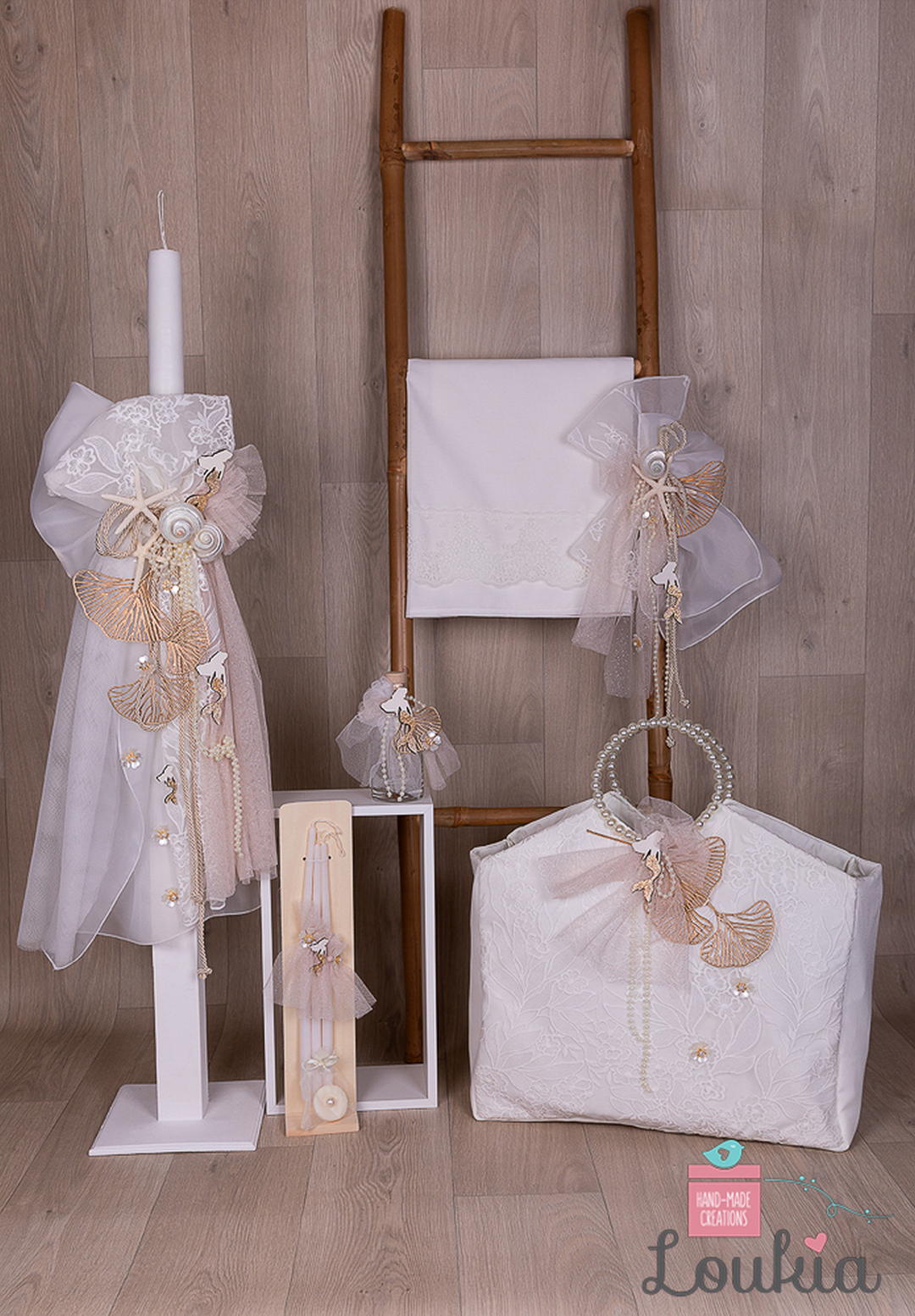 Ένα εντυπωσιακό βαπτιστικό σετ εμπνευσμένο από τη γοητεία της θάλασσας. Σε αποχρώσεις του λευκού και του μπεζ, διακοσμημένο με δαντέλα, κοχύλια, αστερίες και μαργαριτάρια, αποπνέει κομψότητα και φυσική ομορφιά. Το σετ περιλαμβάνει λαμπάδα, λαδοσέτ, πετσέτα και μια υφασμάτινη τσάντα διακοσμημένη με πέρλες και θαλασσινά μοτίβα.