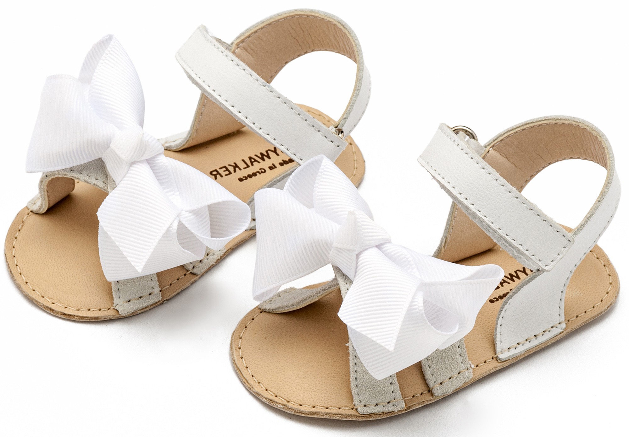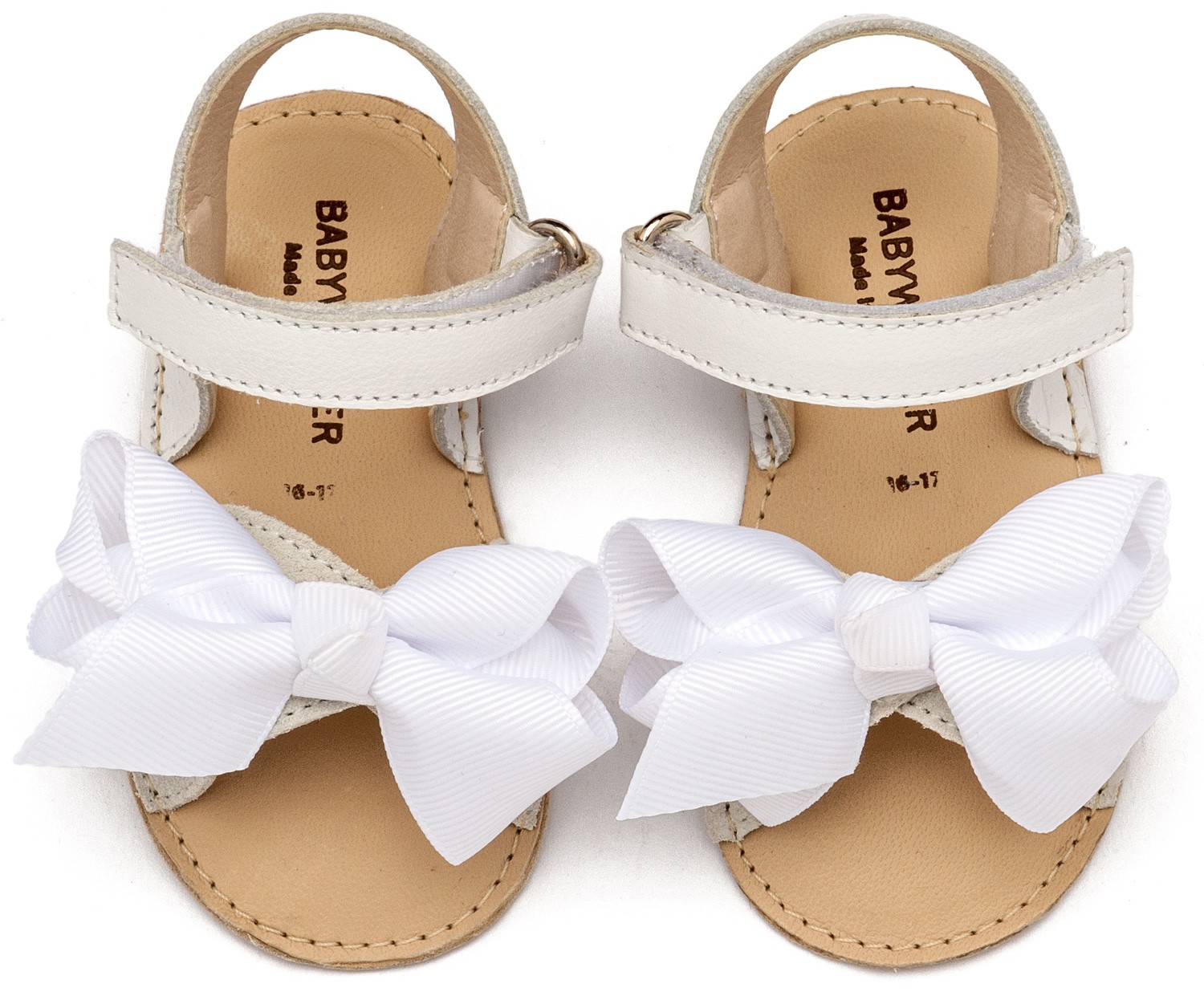 Βρεφικά σανδάλια σε λευκό χρώμα με σουέτ λεπτομέρειες και σατέν φιόγκο, ιδανικά για κομψές και ρομαντικές εμφανίσεις.