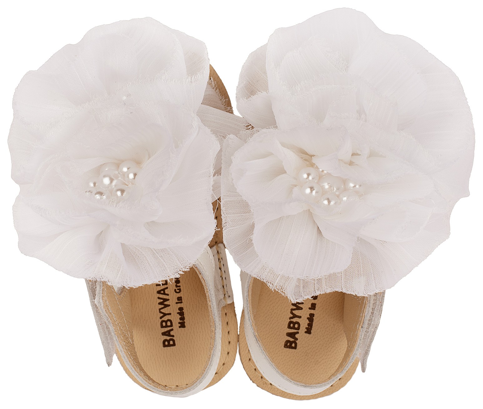 Αυτά τα μοναδικά βρεφικά σανδάλια σε απόχρωση λευκό είναι η απόλυτη επιλογή για κομψές και ξεχωριστές εμφανίσεις. Διαθέτουν εντυπωσιακή διακόσμηση με μεγάλα, αέρινα λουλούδια από απαλό ύφασμα, τα οποία είναι διακοσμημένα με μικρές περλίτσες που χαρίζουν μια πινελιά πολυτέλειας. Η λεπτή δερμάτινη σόλα και το ρυθμιζόμενο λουράκι εξασφαλίζουν άνετη εφαρμογή και σταθερότητα στα πρώτα βήματα του μωρού. Ο συνδυασμός των φυσικών υλικών και του ρομαντικού σχεδιασμού καθιστά αυτά τα σανδάλια ιδανικά για βαφτίσεις, γιορτές και καλοκαιρινές εκδηλώσεις, προσδίδοντας έναν αριστοκρατικό και ταυτόχρονα παιχνιδιάρικο χαρακτήρα.