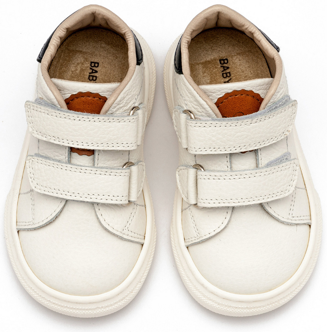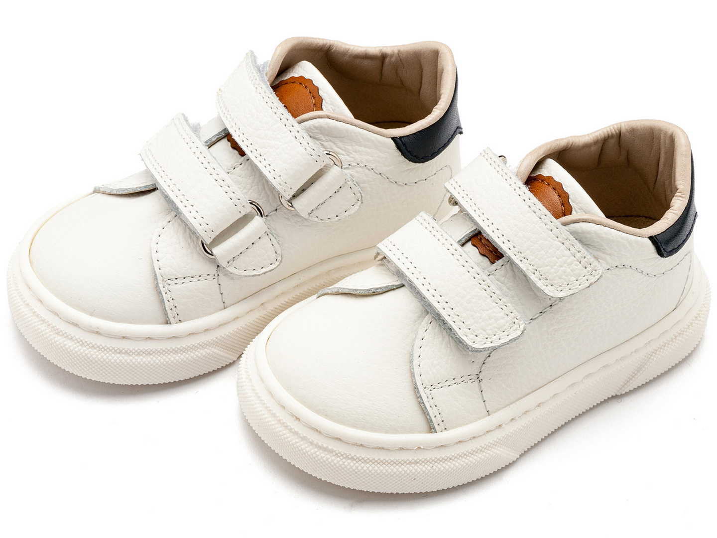 Αυτό είναι ένα ζευγάρι παιδικά sneakers σε λευκό χρώμα, κατασκευασμένα από δέρμα με μαλακή υφή. Διαθέτουν δύο αυτοκόλλητα λουράκια (velcro) για εύκολη εφαρμογή και αφαίρεση, εξασφαλίζοντας σταθερότητα και άνεση στο παιδικό πόδι. Το εσωτερικό είναι επενδυμένο με μαλακή υφασμάτινη φόδρα σε μπεζ απόχρωση, προσφέροντας επιπλέον άνεση. Στο πίσω μέρος υπάρχει μια μικρή λεπτομέρεια σε μαύρο χρώμα, η οποία προσθέτει μια κομψή πινελιά στο σχέδιο. Η σόλα είναι λευκή και παχιά, από ελαστικό υλικό που προσφέρει αντικραδασμική προστασία και σταθερότητα στο βάδισμα. Ιδανικά για casual εμφανίσεις και καθημερινή χρήση, συνδυάζουν άψογα το στυλ και τη λειτουργικότητα.