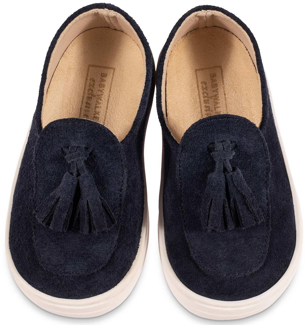 Εντυπωσιακό βαπτιστικό παπούτσι τύπου loafer σε σκούρο μπλε χρώμα, κατασκευασμένο από υψηλής ποιότητας καστόρι που προσφέρει απαλότητα και άνεση στο παιδικό πόδι. Διαθέτει διακοσμητική φούντα στο επάνω μέρος, προσδίδοντας έναν εκλεπτυσμένο και μοντέρνο χαρακτήρα. Η μαλακή, δερμάτινη εσωτερική επένδυση εξασφαλίζει άνετη εφαρμογή και διαπνοή, ενώ η λευκή σόλα από ελαφρύ υλικό παρέχει σταθερότητα και αντικραδασμική προστασία. Ιδανική επιλογή για μια ξεχωριστή βάπτιση, συνδυάζοντας στυλ και άνεση για τους μικρούς κυρίους!
