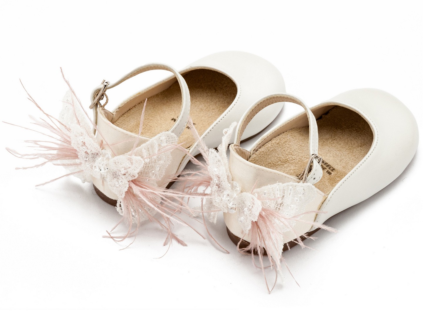Βαπτιστικό παπουτσάκι Babywalker από ιβουάρ δέρμα, με λεπτή μπαρέτα και αγκράφα. Διακοσμημένο στο πίσω μέρος με ρομαντικό φιόγκο από δαντέλα, χάντρες και αέρινα φτερά σε παστέλ ροζ απόχρωση. Κομψό, άνετο και ιδανικό για ιδιαίτερες στιγμές.