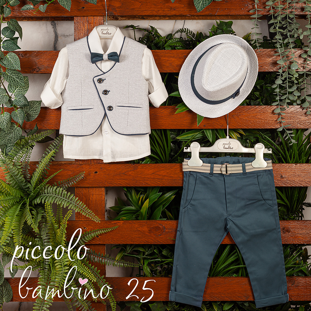 Ένα κομψό και κλασικό βαπτιστικό σετ για αγόρι, αποτελούμενο από λευκό πουκάμισο, γκρι γιλέκο με μπλε παπιγιόν, μπλε παντελόνι με ζώνη και ασορτί καπέλο. Ιδανικό για μια στυλάτη και άνετη εμφάνιση στην ξεχωριστή ημέρα της βάπτισης.