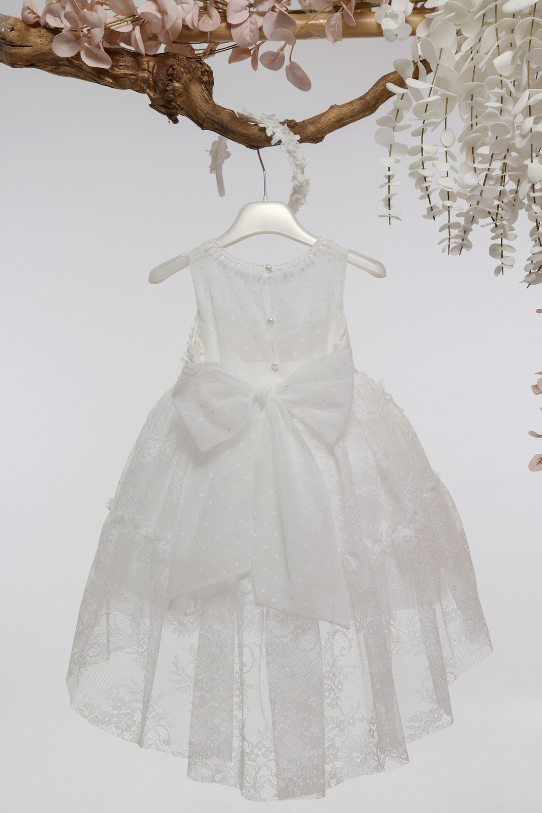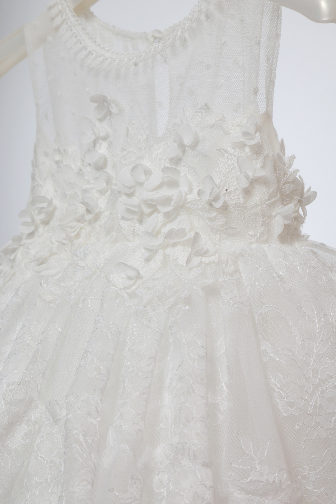 Ένα ονειρικό βαπτιστικό φόρεμα σε ιβουάρ απόχρωση, εμπνευσμένο από την κομψότητα της δαντέλας και τη ρομαντική αίσθηση των τρισδιάστατων λουλουδιών. Το επάνω μέρος είναι διακοσμημένο με διακριτικές πέρλες και ανάγλυφα λουλούδια που δίνουν μια αίσθηση πολυτέλειας και φινέτσας. Η φούστα αποτελείται από πολλές στρώσεις φίνας δαντέλας, δημιουργώντας έναν αέρινο και πλούσιο όγκο που θυμίζει παραμυθένιο στυλ. Συνοδεύεται από ασορτί στέκα μαλλιών, διακοσμημένη με λουλούδια και δαντέλα, ολοκληρώνοντας το σύνολο με μια γλυκιά και κομψή πινελιά. Ένα υπέροχο φόρεμα, ιδανικό για μια ξεχωριστή βάπτιση γεμάτη λάμψη και ρομαντισμό.