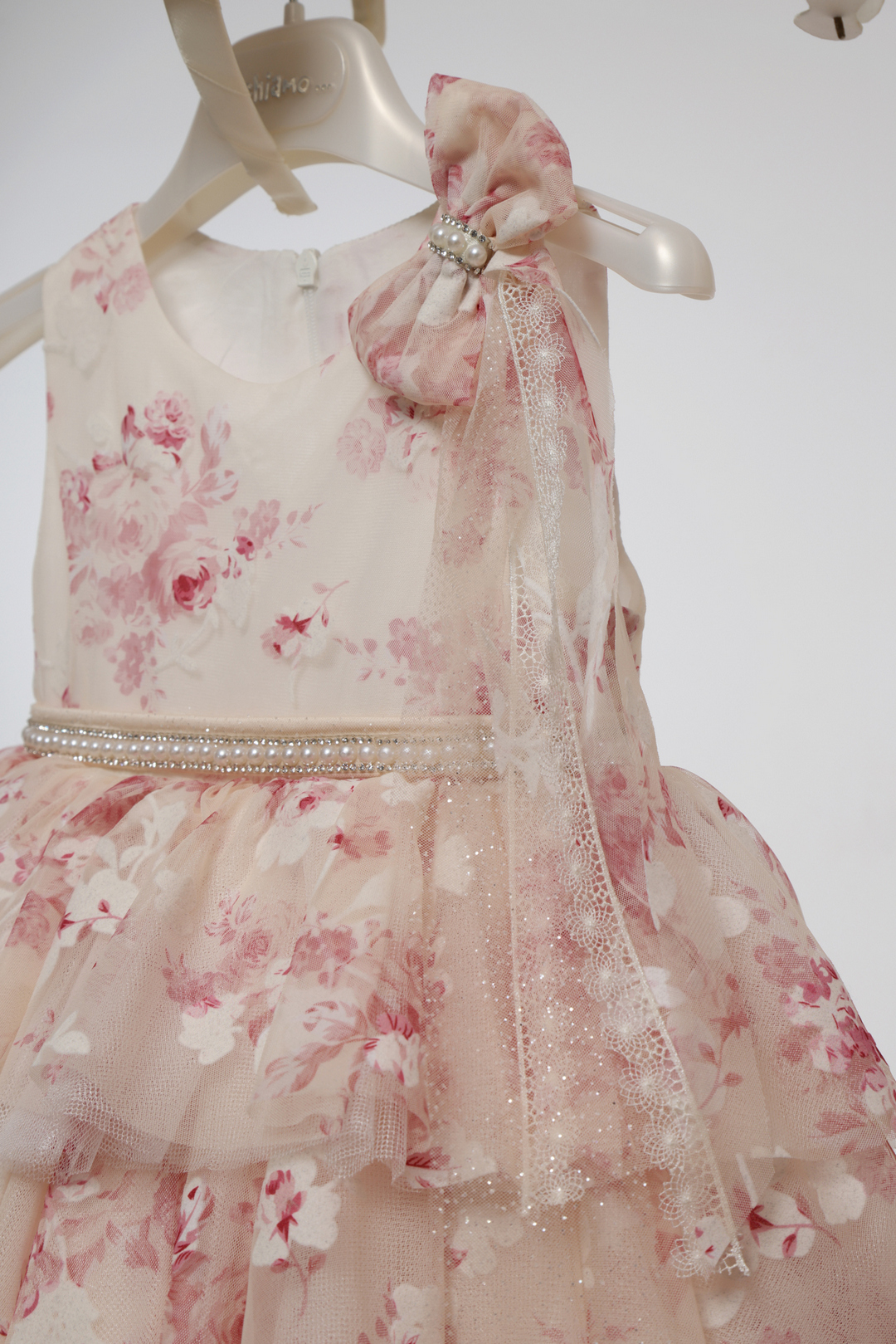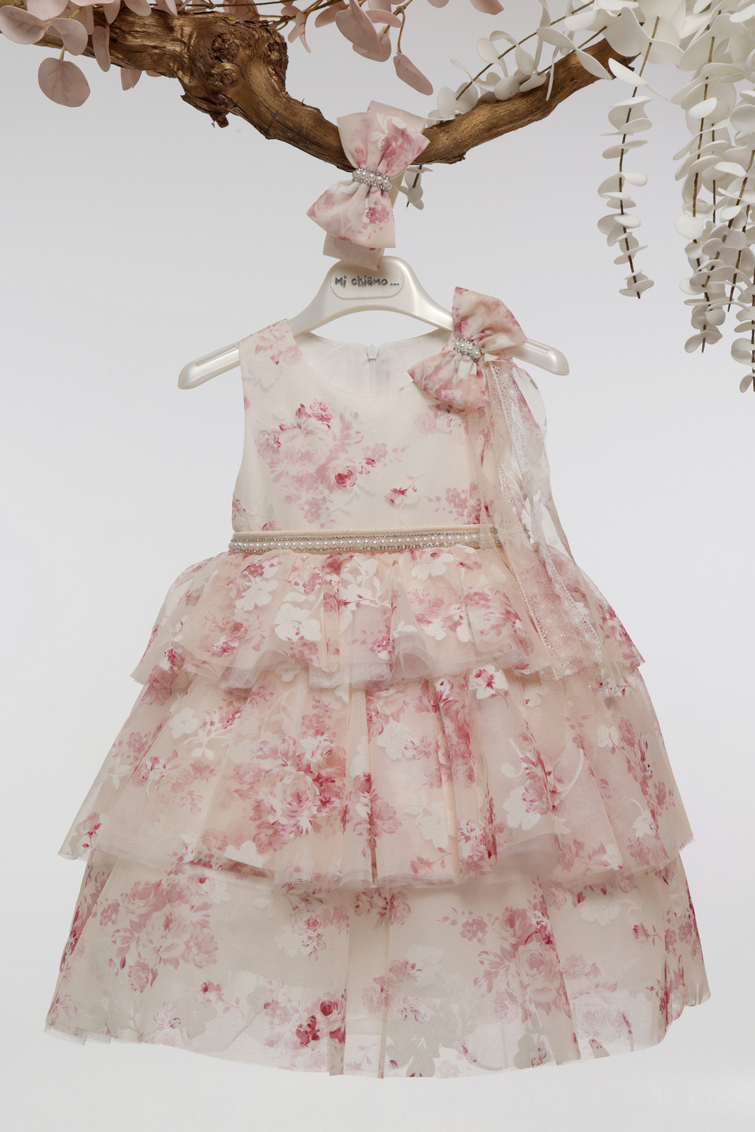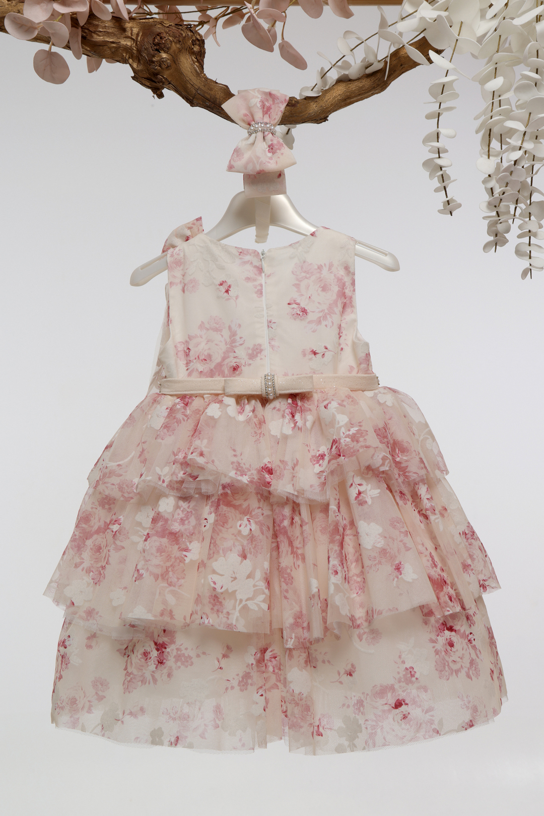 Ρομαντικό βαπτιστικό φόρεμα σε ροζ εμπριμέ με λουλουδάτη εκτύπωση, ζώνη με πέρλες, φούστα με βολάν από τούλι και φιόγκο στον ώμο. Συνοδεύεται από ασορτί κορδέλα μαλλιών!