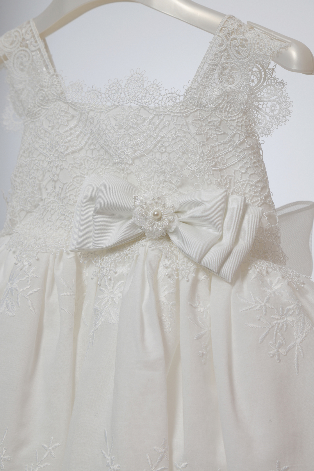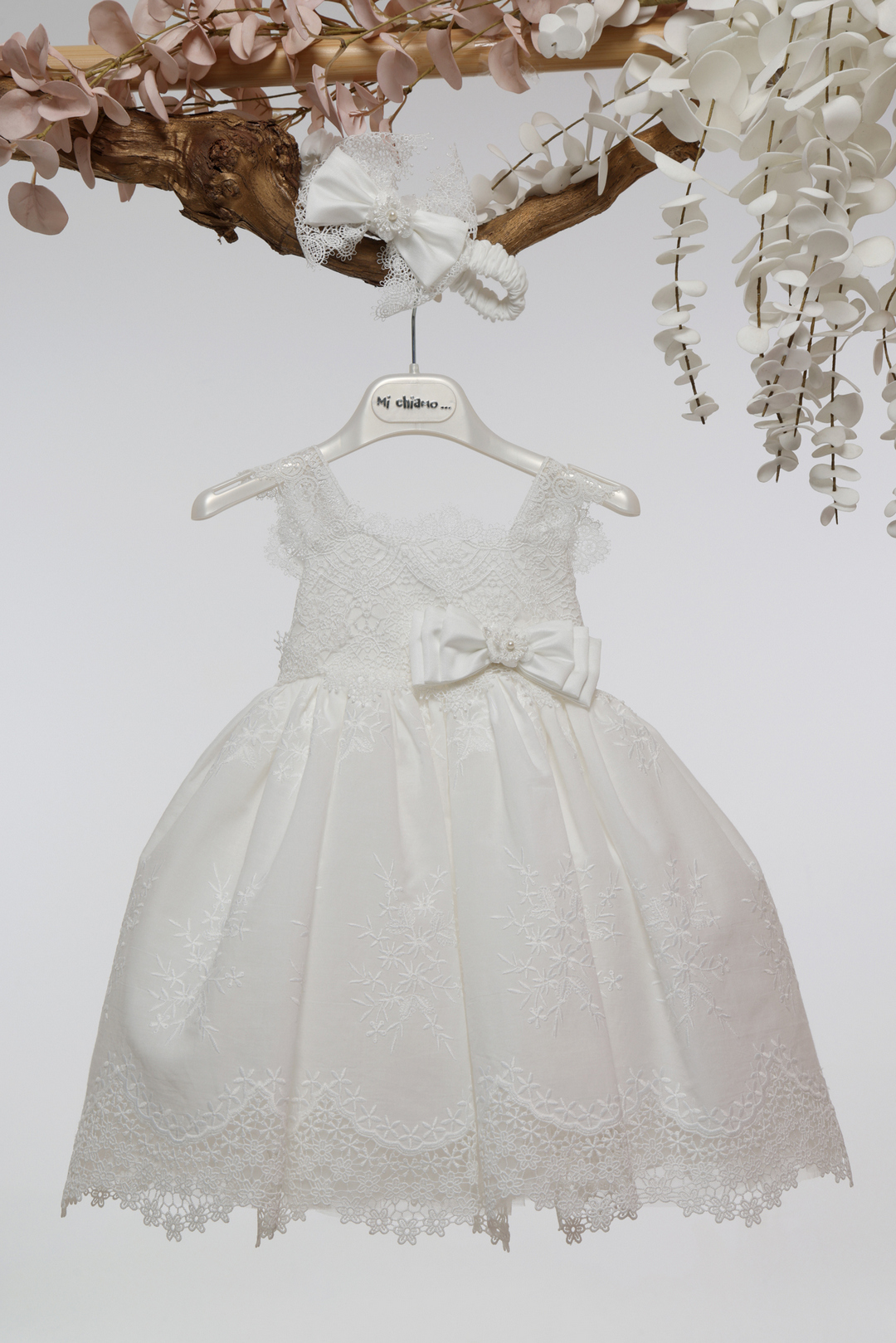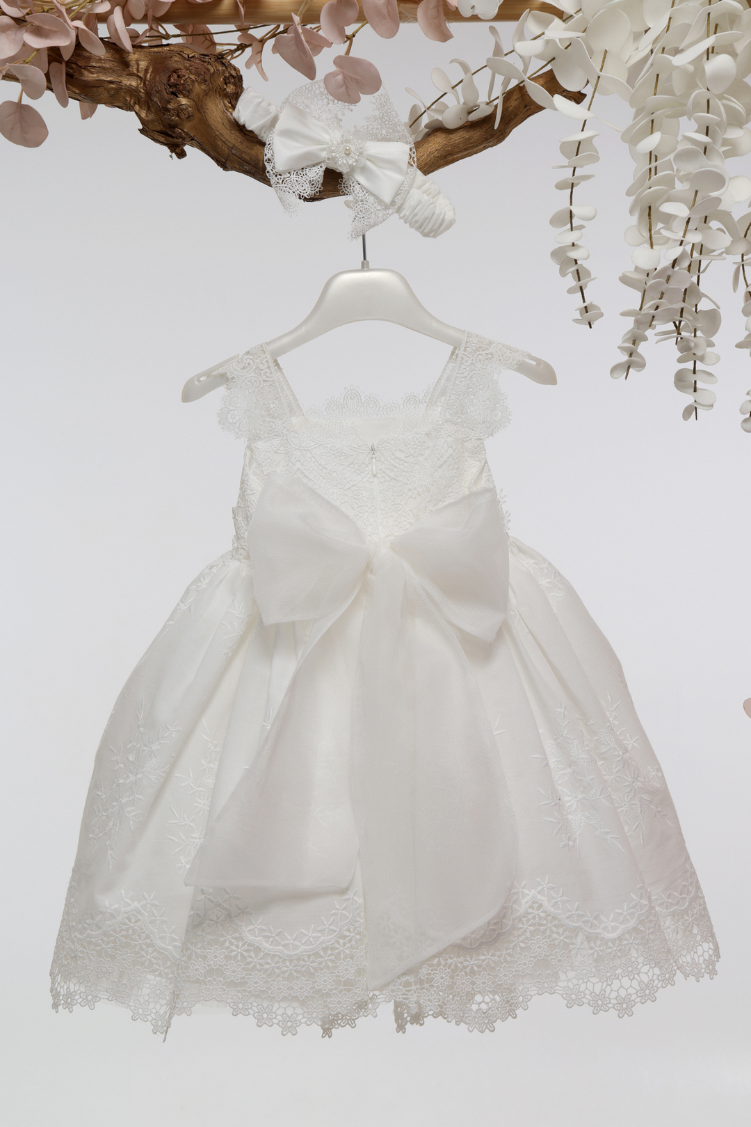 Ρομαντικό βαπτιστικό φόρεμα σε ιβουάρ απόχρωση, διακοσμημένο με φίνα δαντέλα και περίτεχνο broderie κέντημα. Διαθέτει σατέν φιόγκο στη μέση και συνοδεύεται από ασορτί κορδέλα για τα μαλλιά. Ιδανικό για μια κομψή και ξεχωριστή εμφάνιση.