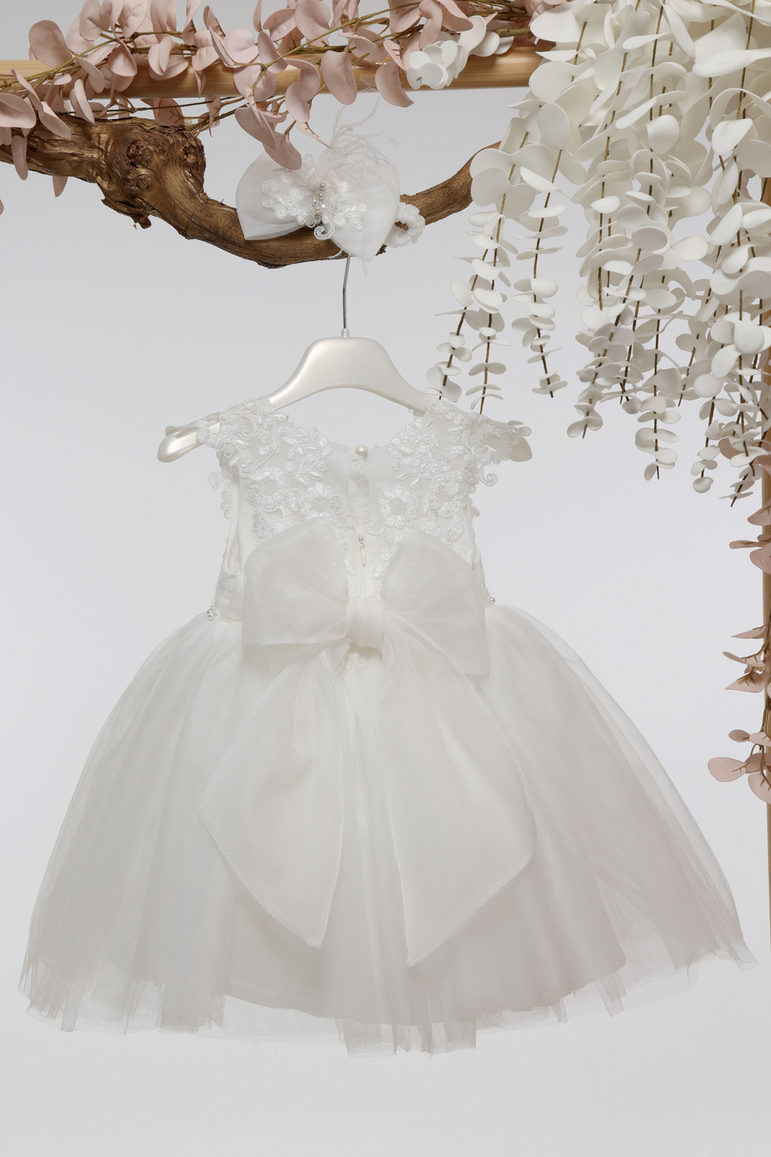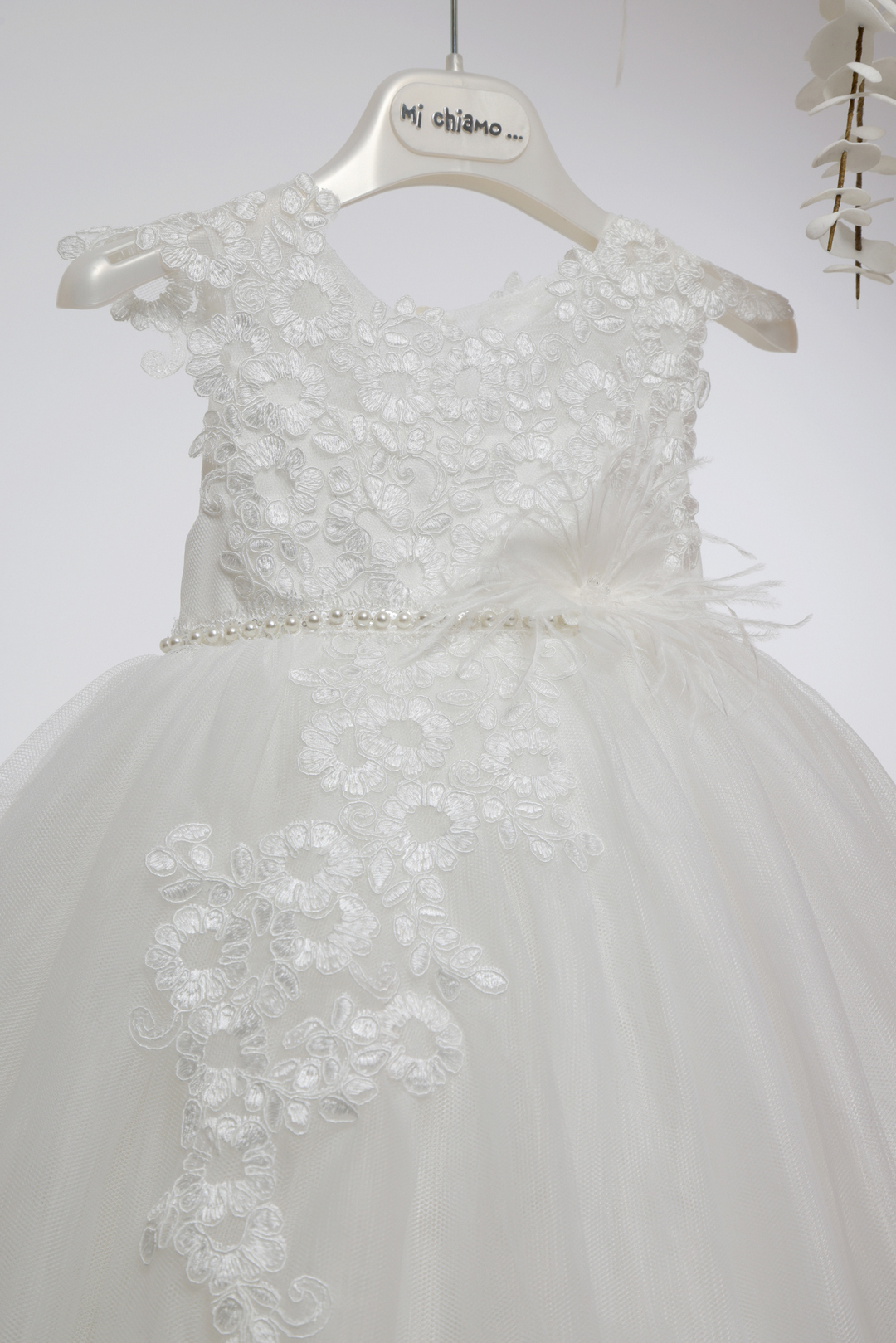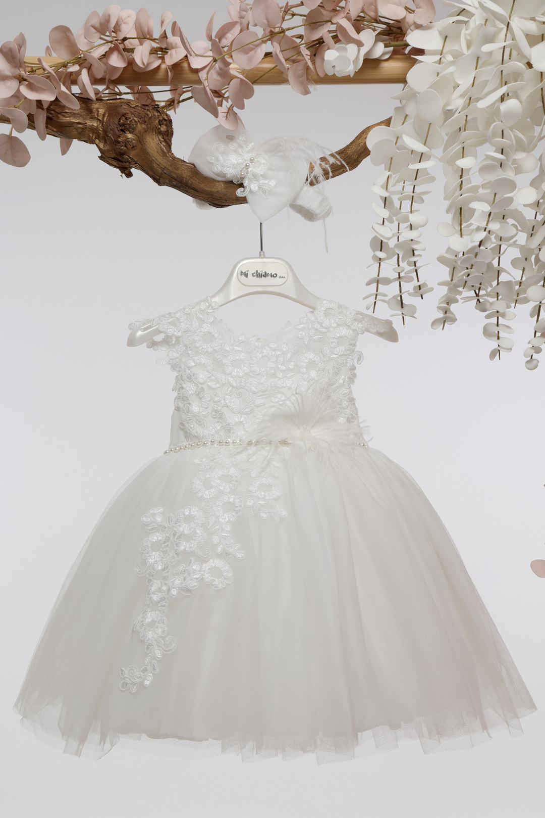Ιβουάρ βαπτιστικό φόρεμα με ανάγλυφη λουλουδάτη δαντέλα στο μπούστο, διακοσμητική ζώνη με πέρλες και φτερά, και αέρινη τούλινη φούστα. Κομψό και ρομαντικό!