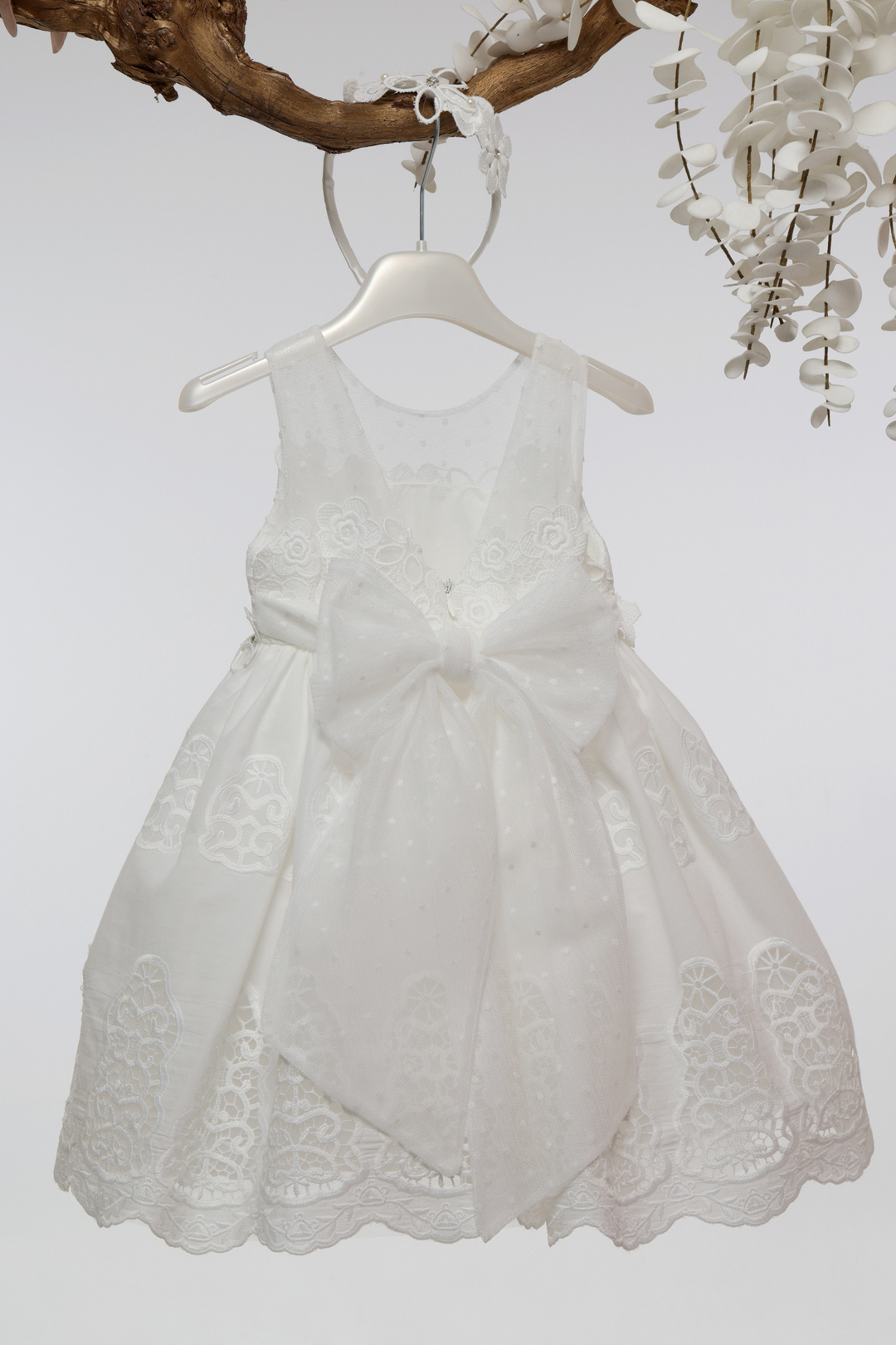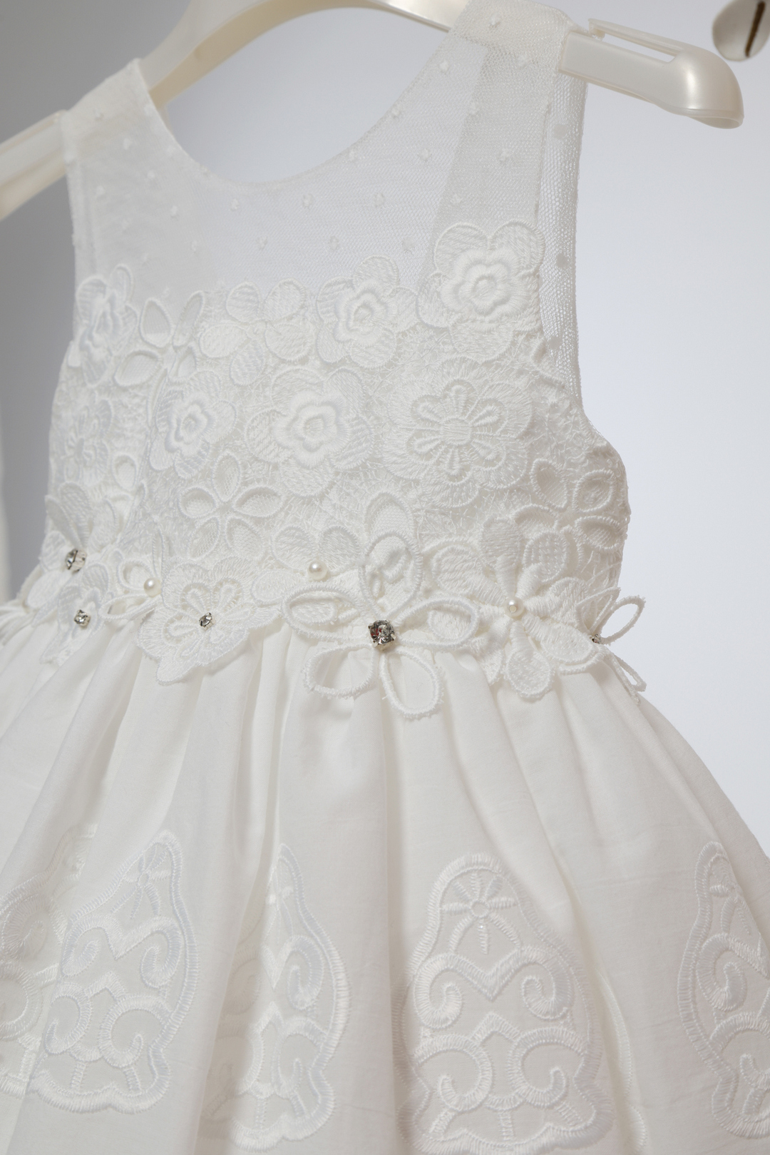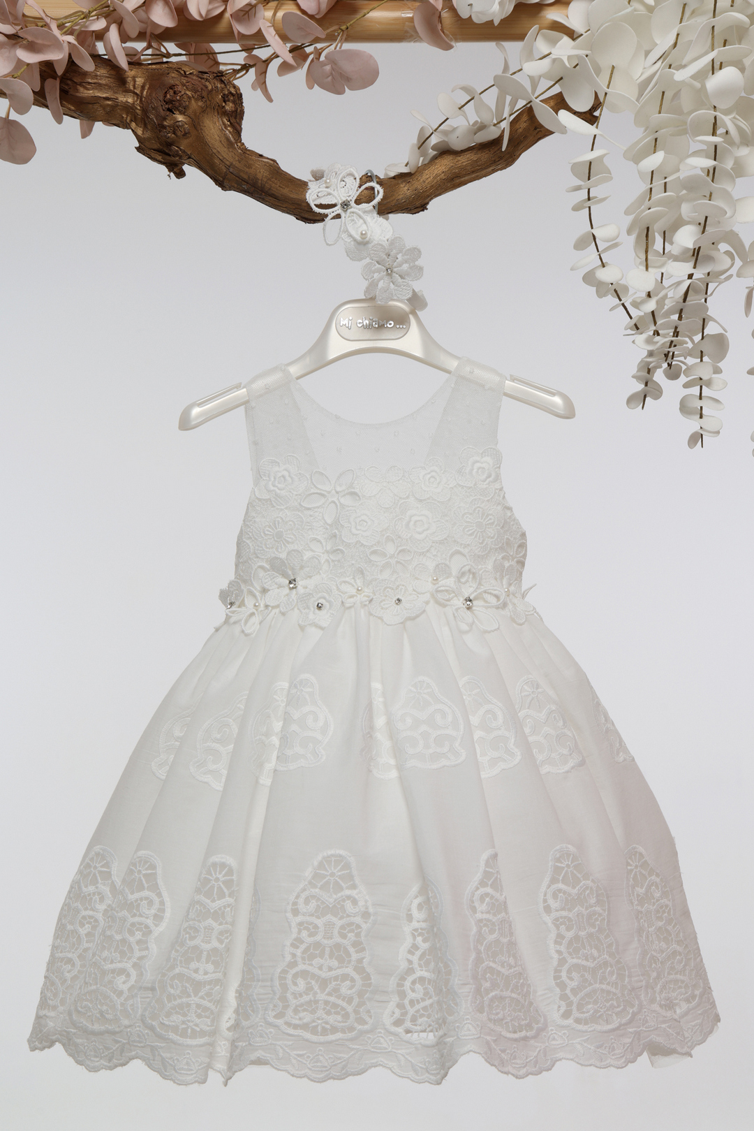 Βαπτιστικό φόρεμα σε ιβουάρ απόχρωση με φίνα δαντέλα στο μπούστο και περίτεχνο broderie κέντημα στη φούστα. Διακοσμημένο με λουλούδια, πέρλες και στρασάκια στη μέση. Συνοδεύεται από ασορτί κορδέλα μαλλιών. Ιδανικό για μια ρομαντική εμφάνιση!