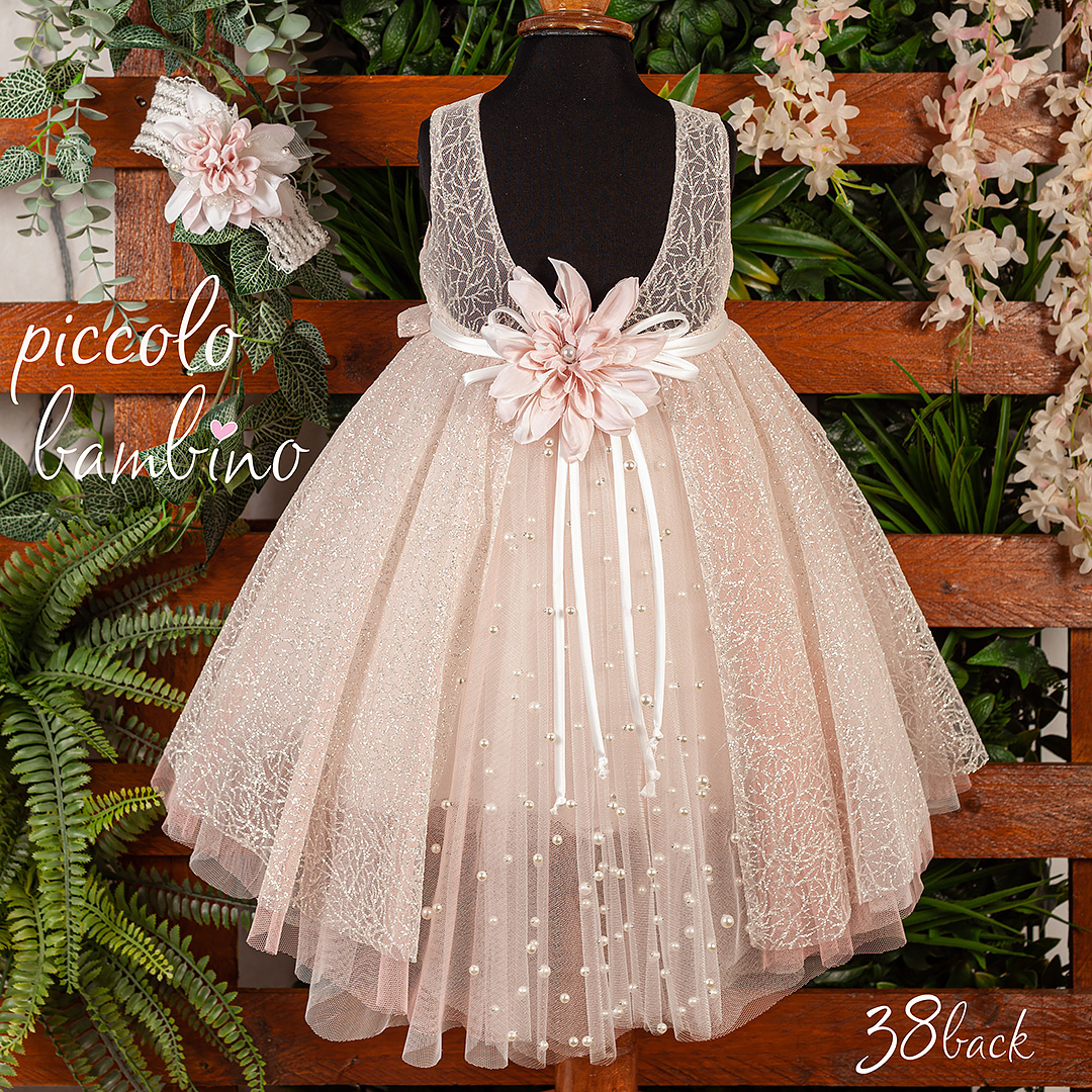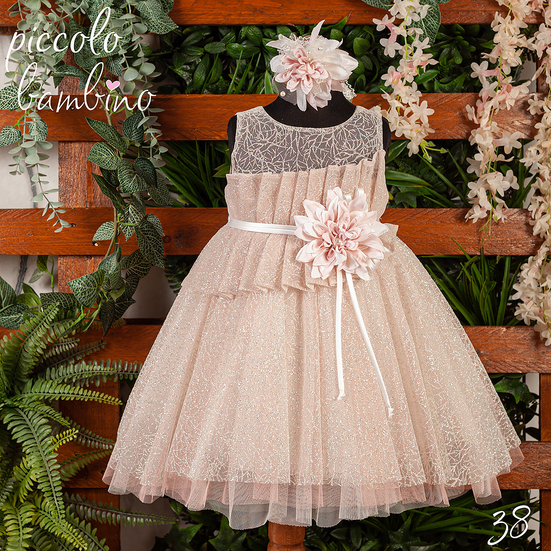 Το βαπτιστικό φόρεμα “Piccolo Bambino 38” συνδυάζει ρομαντική κομψότητα με διακριτική λάμψη, δημιουργώντας μια αέρινη και ονειρική εμφάνιση. Η απόχρωσή του σε απαλό ροζ-nude δίνει μια ζεστή και ρομαντική αίσθηση, ιδανική για ξεχωριστές στιγμές. Το ύφασμά του είναι λεπτό και φίνο, με ένα υπέροχο διακριτικό glitter που χαρίζει φωτεινότητα σε κάθε κίνηση. Το μπούστο του φορέματος διαθέτει διάφανο τούλι με περίτεχνο σχέδιο δαντέλας, ενώ η ασύμμετρη πλισέ διακόσμηση στο στήθος προσθέτει μια μοντέρνα πινελιά. Η μέση τονίζεται με μια λεπτή ζώνη, διακοσμημένη με ένα εντυπωσιακό χειροποίητο λουλούδι από σατέν, που προσφέρει έναν ρομαντικό και πολυτελή χαρακτήρα. Η φούστα του φορέματος είναι πλούσια, με πολλαπλές στρώσεις τούλι για ανάλαφρο όγκο και κίνηση, απογειώνοντας την αισθητική του συνόλου. Συνοδεύεται από ένα ασορτί αξεσουάρ μαλλιών διακοσμημένο με λουλούδια και πέρλες, ολοκληρώνοντας μια εμφάνιση βγαλμένη από παραμύθι.