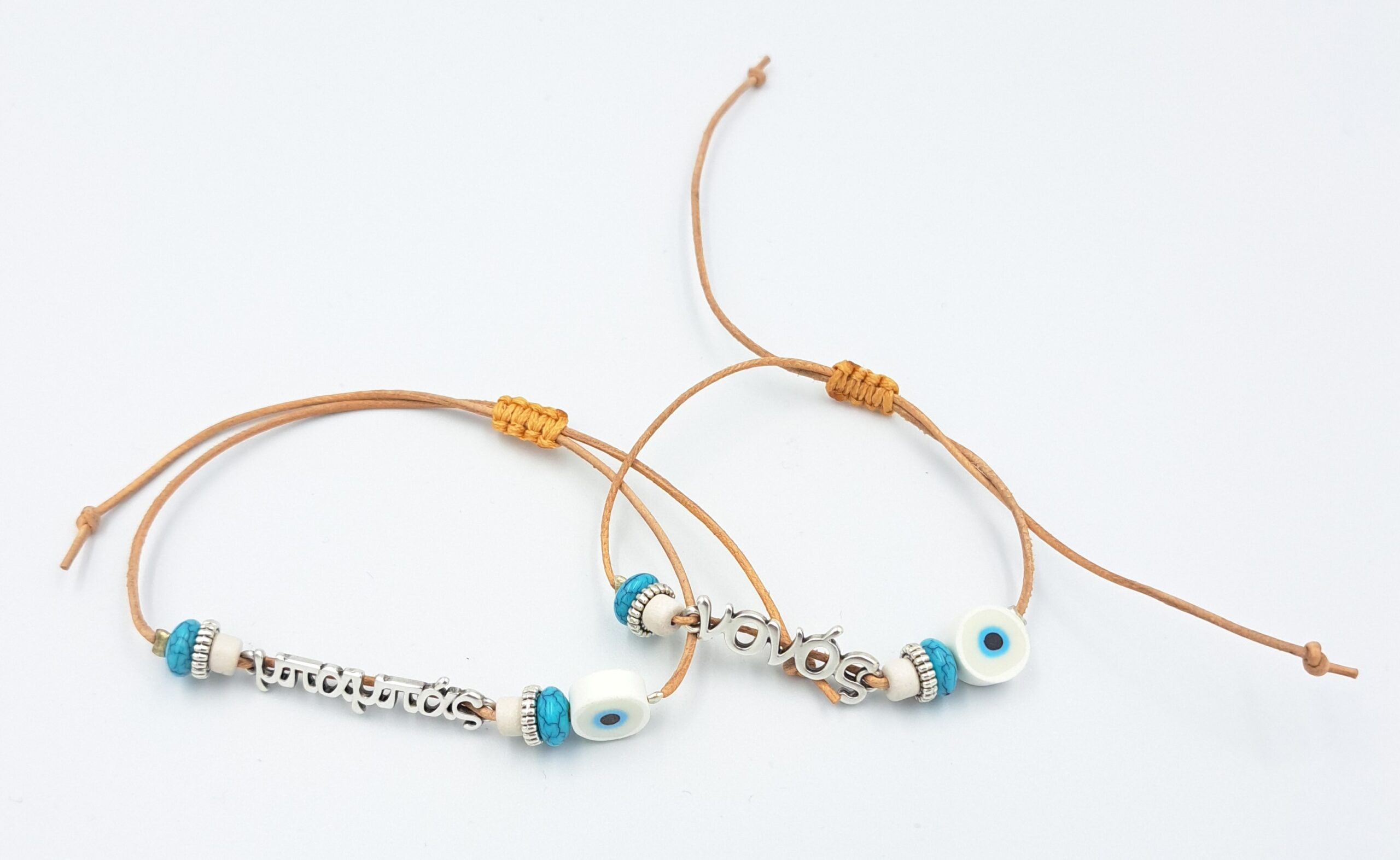 Βραχιόλι μπεζ δέρμα, μάτι, γαλάζια και λευκή χάντρα, για τον μπαμπά, τον νονό και τον παππού. Οι φωτογραφίες έχουν υποστεί επεξεργασία και τα χρώματα ίσως να διαφέρουν λίγο στην πραγματικότητα. Η Τιμή αφορά συσκευασία 2 τεμαχίων.